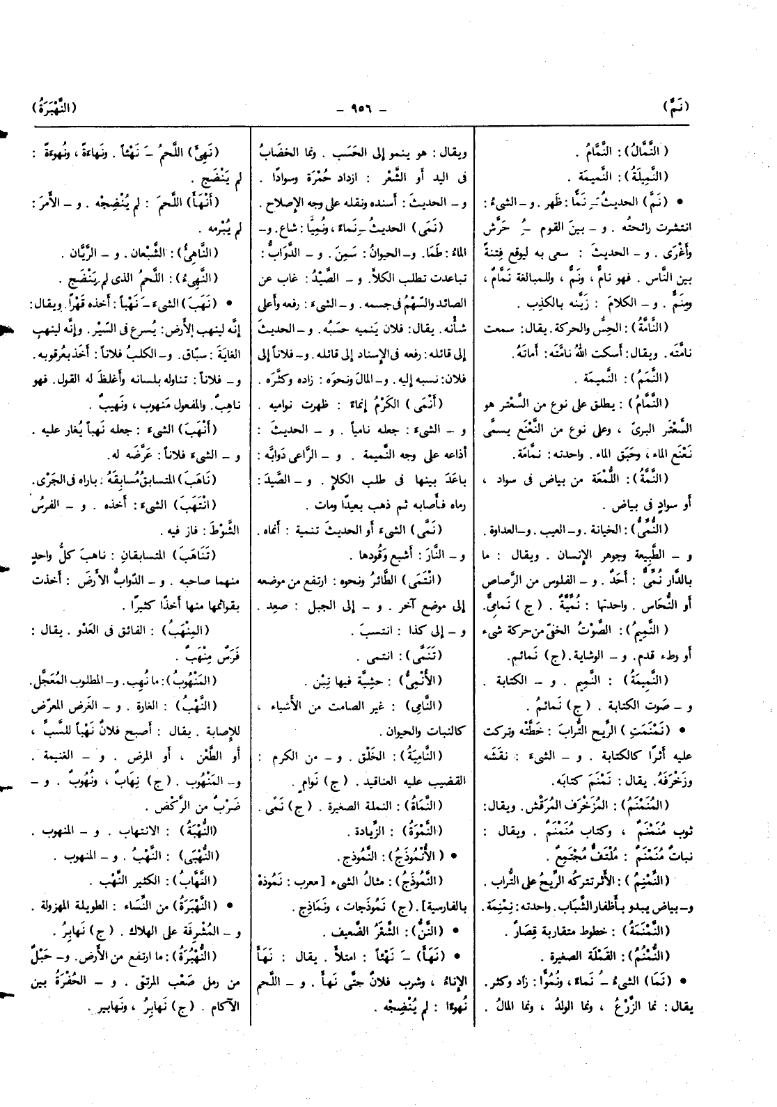 (نمى) الحَدِيث نَمَاء ونميا شاع وَالْمَاء طما وَالْحَيَوَان سمن وَالدَّوَاب تَبَاعَدت تطلب الْكلأ وَالصَّيْد غَابَ عَن الصَّائِد والسهم فِي جِسْمه وَالشَّيْء رَفعه وَأَعْلَى شَأْنه يُقَال فلَان ينميه حَسبه والْحَدِيث إِلَى قَائِله رَفعه فِي الْإِسْنَاد إِلَى قَائِله وَفُلَانًا إِلَى فلَان نسبه إِلَيْهِ وَالْمَال وَنَحْوه زَاده وكثره