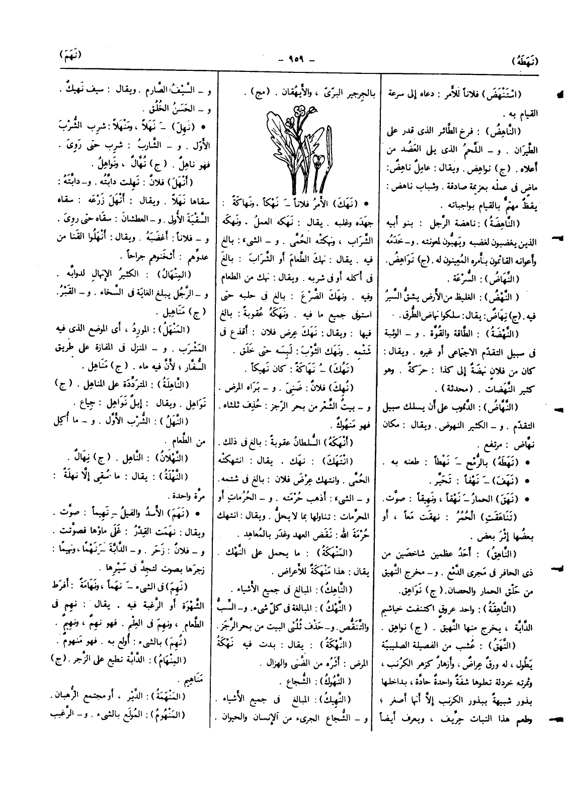 (نهم) فِي الشَّيْء نهما ونهامة أفرط الشَّهْوَة أَو الرَّغْبَة فِيهِ يُقَال نهم فِي الطَّعَام ونهم فِي الْعلم فَهُوَ نهم ونهيم