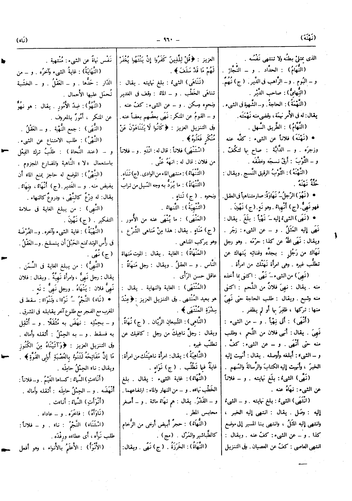 (نهى) الشَّيْء بلغ نهايته وَفُلَانًا عَن الشَّيْء نَهَاهُ عَنهُ