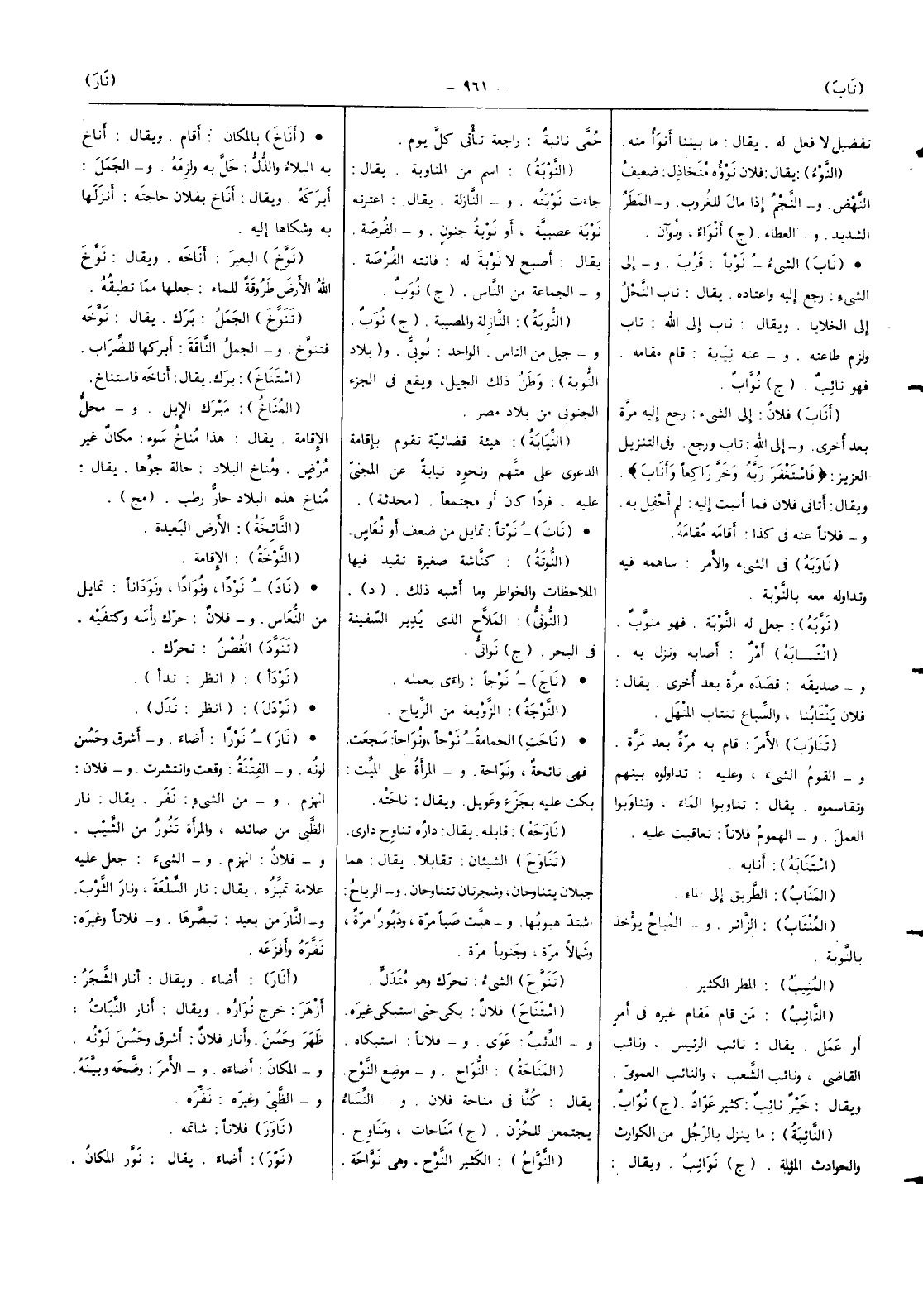 الشَّيْء نوبا قرب وَإِلَى الشَّيْء رَجَعَ إِلَيْهِ واعتاده يُقَال نَاب النَّحْل إِلَى الخلايا وَيُقَال نَاب إِلَى الله تَابَ وَلزِمَ طَاعَته وَعنهُ نِيَابَة قَامَ مقَامه فَهُوَ نَائِب (ج) نواب
