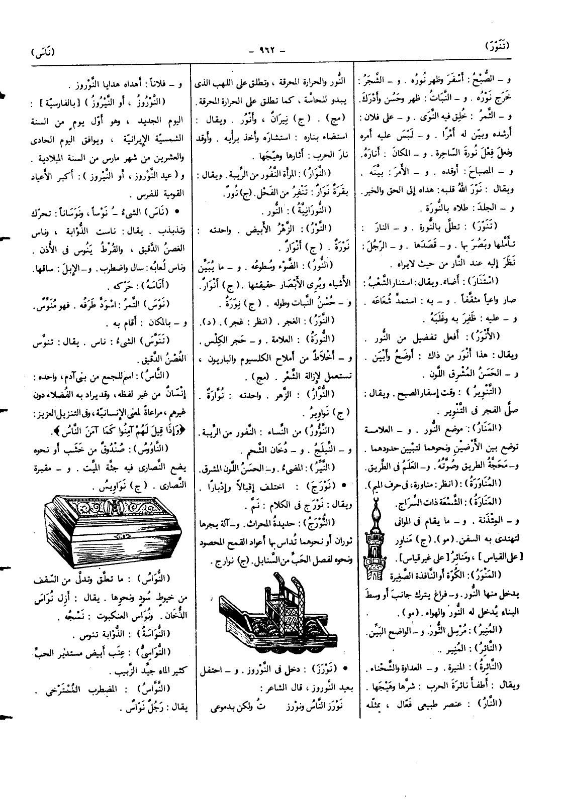 (النُّور) الضَّوْء وسطوعه وَمَا يبين الْأَشْيَاء ويري الْأَبْصَار حَقِيقَتهَا (ج) أنوار وَحسن النَّبَات وَطوله (ج) نورة