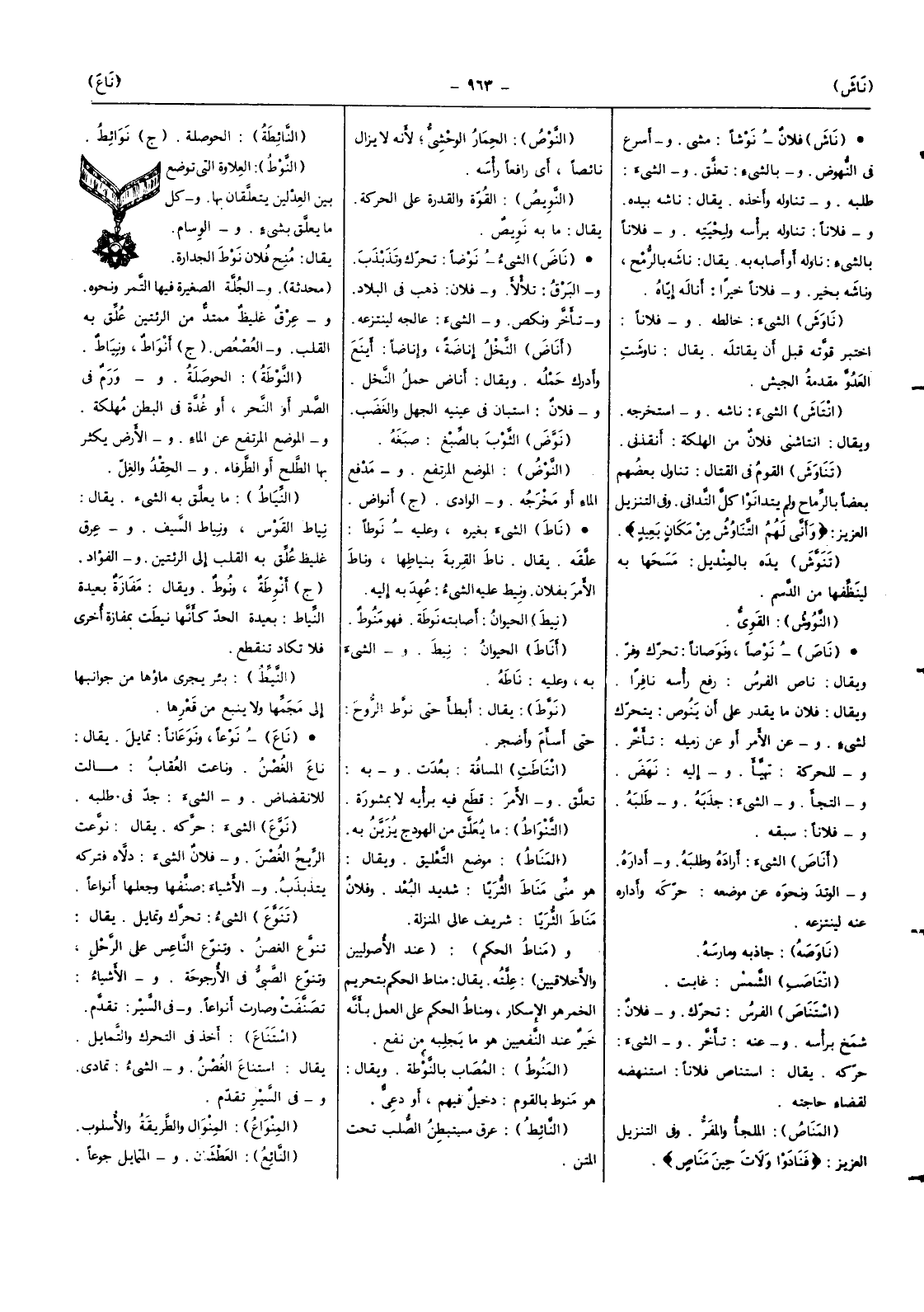 نوصا ونوصانا تحرّك وفر وَيُقَال ناص الْفرس رفع رَأسه نافرا وَيُقَال فلَان مَا يقدر على أَن ينوص يَتَحَرَّك لشَيْء وَعَن الْأَمر أَو عَن زميله تَأَخّر وللحركة تهَيَّأ وَإِلَيْهِ نَهَضَ والتجأ وَالشَّيْء جذبه وَطَلَبه وَفُلَانًا سبقه