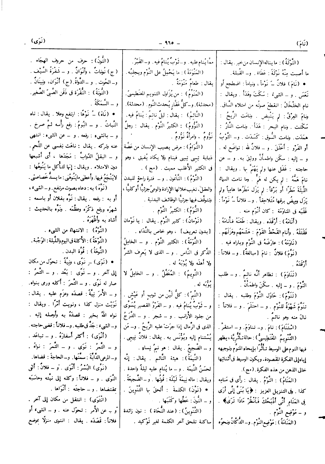 فلَان نوما ونياما اضْطجع أَو نعس وَالشَّيْء سكت وهدأ وَيُقَال نَام الخلخال انْقَطع صَوته من امتلاء السَّاق ونام الْعرق لم ينبض ونامت الرّيح سكنت ونام الْبَحْر هدأ ونامت النَّار همدت ونامت السُّوق كسدت وَالثَّوْب أَو الفرو أخلق وَفُلَان الله تواضع لَهُ وَإِلَيْهِ سكن وَاطْمَأَنَّ ووثق بِهِ وَعَن حَاجته غفل عَنْهَا وَلم يهتم بهَا وَيُقَال نَام همه لم يكن لَهُ هم وَمَا نَامَتْ السَّمَاء اللَّيْلَة مَطَرا أَو برقا لم ينزل مطرها هاميا وَلم يزل وميض برقها متلاحقا وَفُلَانًا نوما غَلبه فِي المناومة كَانَ أنوم مِنْهُ