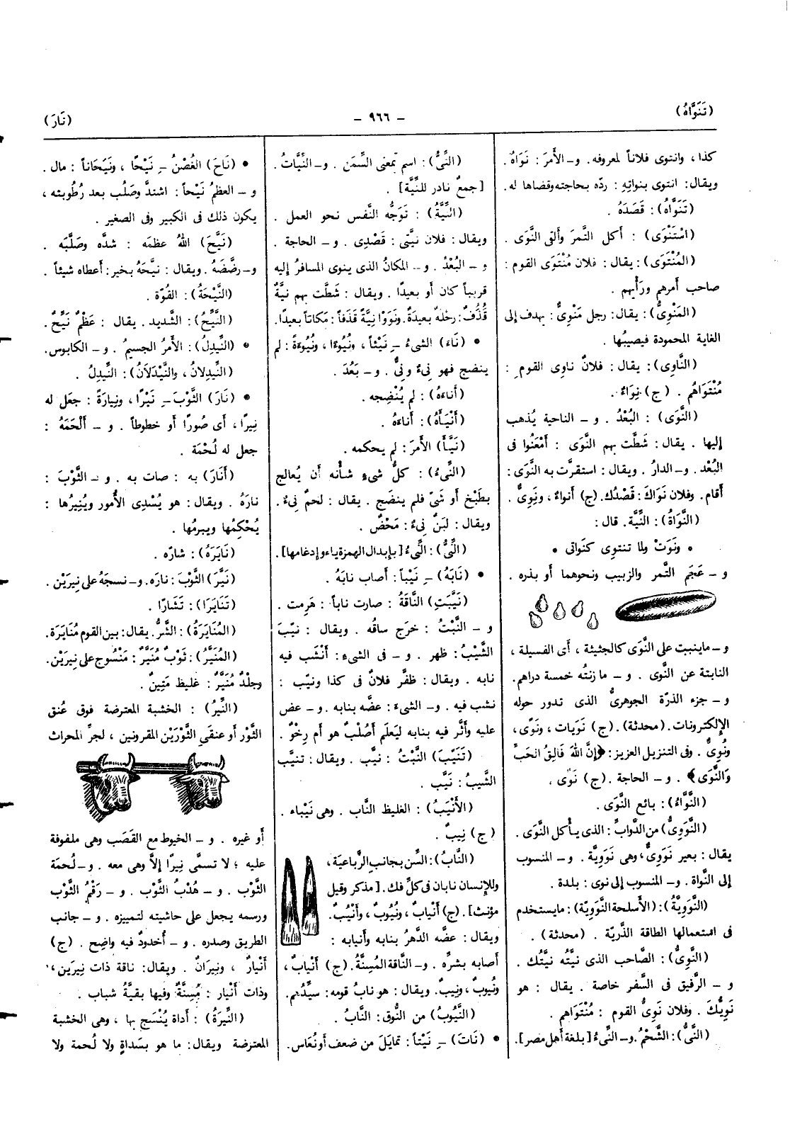 (النير) الْخَشَبَة المعترضة فَوق عنق الثور أَو عنقِي الثورين المقرونين لجر المحراث أَو غَيره والخيوط مَعَ الْقصب وَهِي ملفوفة عَلَيْهِ لَا تسمى نيرا إِلَّا وَهِي مَعَه ولحمة الثَّوْب وهدب الثَّوْب ورقم الثَّوْب ورسمه يَجْعَل على حَاشِيَته لتمييزه وجانب الطَّرِيق وصدره وأخدود فِيهِ وَاضح (ج) أنيار ونيران وَيُقَال نَاقَة ذَات نيرين وَذَات أنيار مُسِنَّة وفيهَا بَقِيَّة شباب