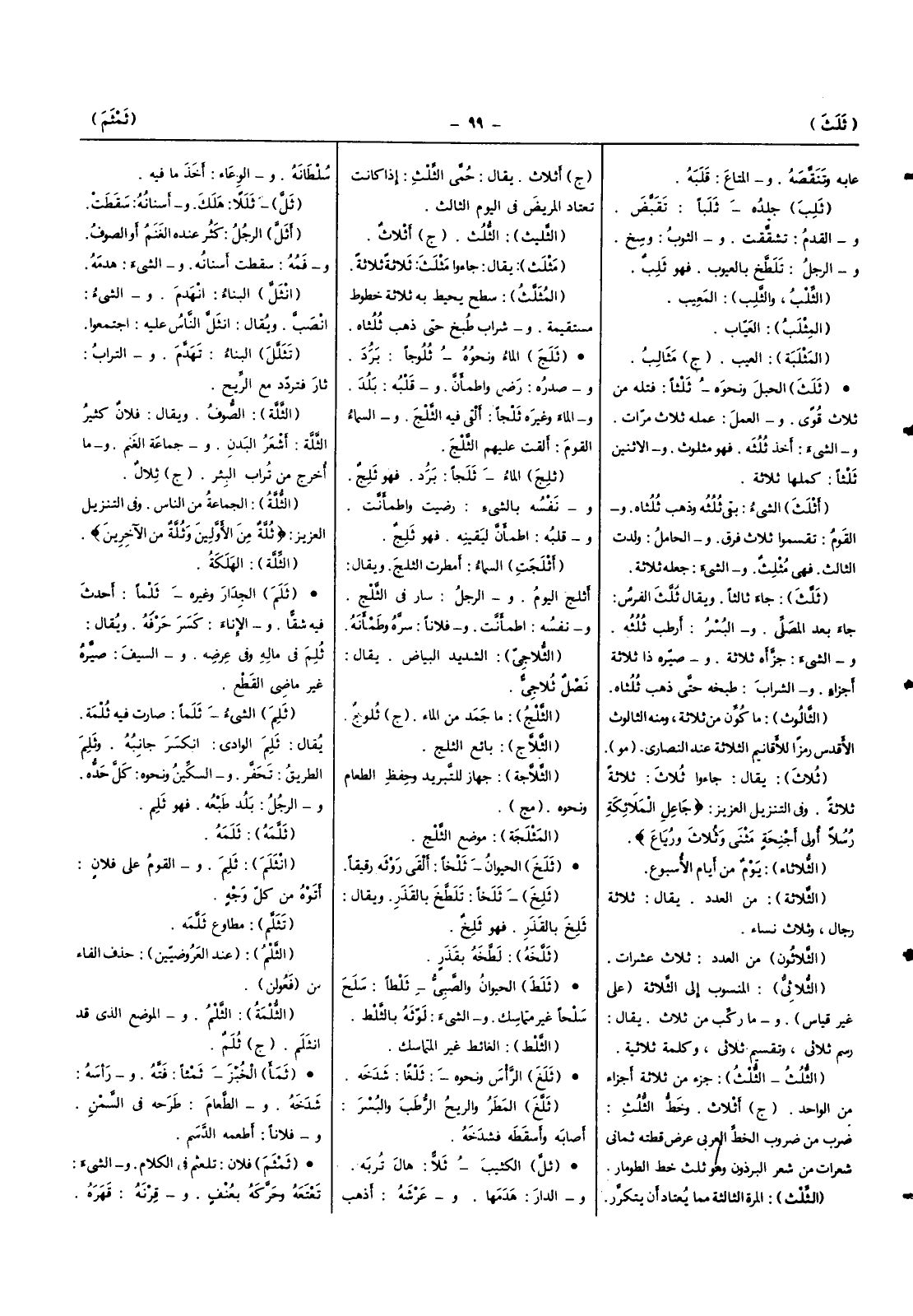 (ثلث) جَاءَ ثَالِثا وَيُقَال ثلث الْفرس جَاءَ بعد الْمُصَلِّي والبسر أرطب ثلثه وَالشَّيْء جزأه ثَلَاثَة وصيره ذَا ثَلَاثَة أَجزَاء وَالشرَاب طبخه حَتَّى ذهب ثُلُثَاهُ