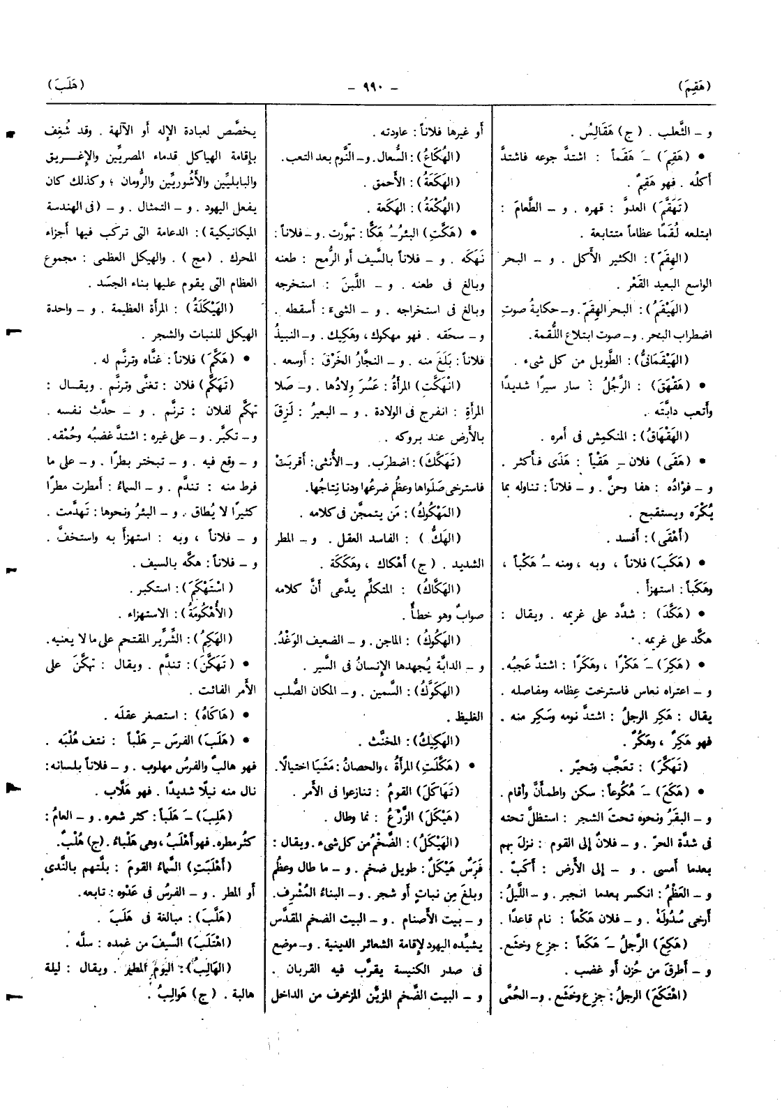 (الهيكل) الضخم من كل شَيْء وَيُقَال فرس هيكل طَوِيل ضخم وَمَا طَال وَعظم وَبلغ من نَبَات أَو شجر وَالْبناء المشرف وَبَيت الْأَصْنَام وَالْبَيْت الضخم الْمُقَدّس يشيده الْيَهُود لإِقَامَة الشعائر الدِّينِيَّة وَمَوْضِع فِي صدر الْكَنِيسَة يقرب فِيهِ القربان وَالْبَيْت الضخم المزين المزخرف من الدَّاخِل يخصص لعبادة الْإِلَه أَو الْآلهَة وَقد شغف بِإِقَامَة الهياكل قدماء المصريين والإغريق والبابليين والأشوريين والرومان وَكَذَلِكَ كَانَ يفعل الْيَهُود والتمثال و (فِي الهندسة الميكانيكية) الدعامة الَّتِي تركب فِيهَا أَجزَاء المحرك (مج) والهيكل العظمي مَجْمُوع الْعِظَام الَّتِي يقوم عَلَيْهَا بِنَاء الْجَسَد