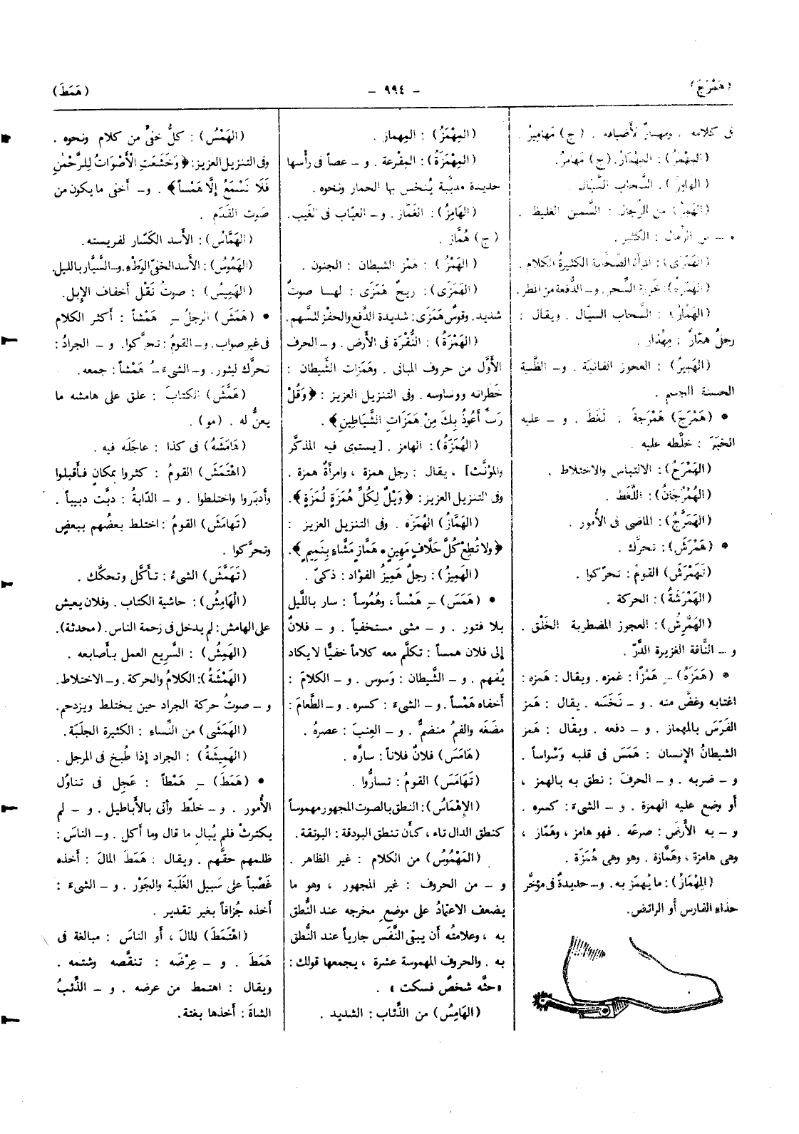همزا غمزه وَيُقَال همزه اغتابه وغض مِنْهُ ونخسه يُقَال همز الْفرس بالمهماز وَدفعه وَيُقَال همز الشَّيْطَان الْإِنْسَان هَمس فِي قلبه وسواسا وضربه والحرف نطق بِهِ بِالْهَمْز أَو وضع عَلَيْهِ الْهمزَة وَالشَّيْء كَسره وَبِه الأَرْض صرعه فَهُوَ هامز وهماز وَهِي هامزة وهمازة وَهُوَ وَهِي همزَة