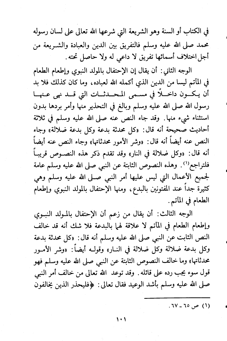 الوجه الثالث: أن يقال من زعم أن الاحتفال بالمولد النبوي وإطعام الطعام في المآتم لا علاقة لهما بالبدعة فلا شك أنه قد خالف النص الثابت عن النبي - صلى الله عليه وسلم - أنه قال: «كل محدثة بدعة وكل بدعة ضلالة وكل ضلالة في النار» وقوله أيضاً: «وشر الأمور محدثاتها» وما خالف النصوص الثابتة عن النبي - صلى الله عليه وسلم - فهو قول سوء يجب رده على قائله. وقد توعد الله تعالى من خالف أمر النبي - صلى الله عليه وسلم - بأشد الوعيد فقال تعالى: {فليحذر الذين يخالفون