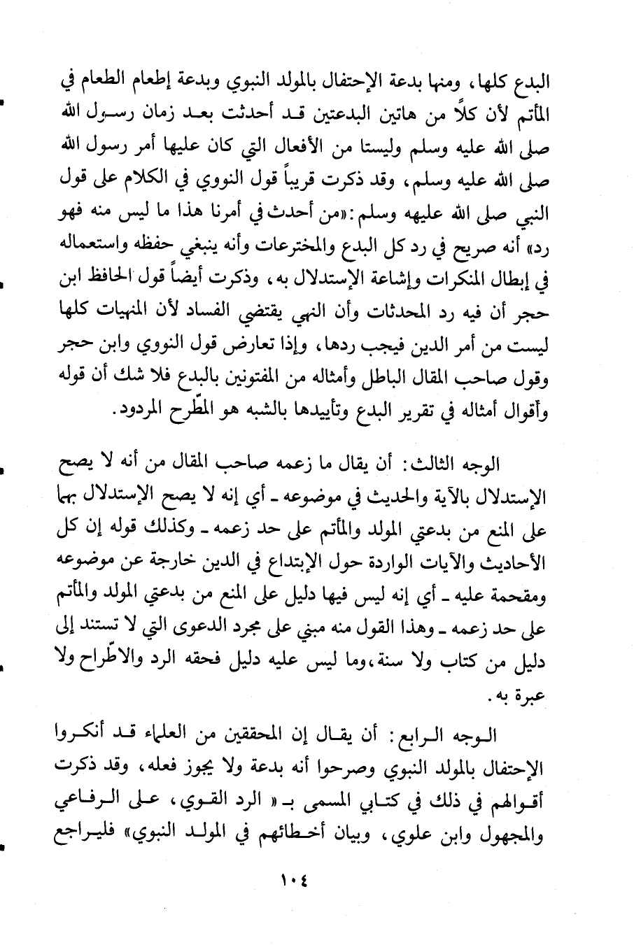 الوجه الرابع: أن يقال إن المحققين من العلماء قد أنكروا الاحتفال بالمولد النبوي وصرحوا أنه بدعة ولا يجوز فعله, وقد ذكرت أقوالهم في ذلك في كتابي المسمى بـ «الرد القويم, على الرفاعي والمجهول وابن علوي, وبيان أخطائهم في المولد النبوي» فليراجع