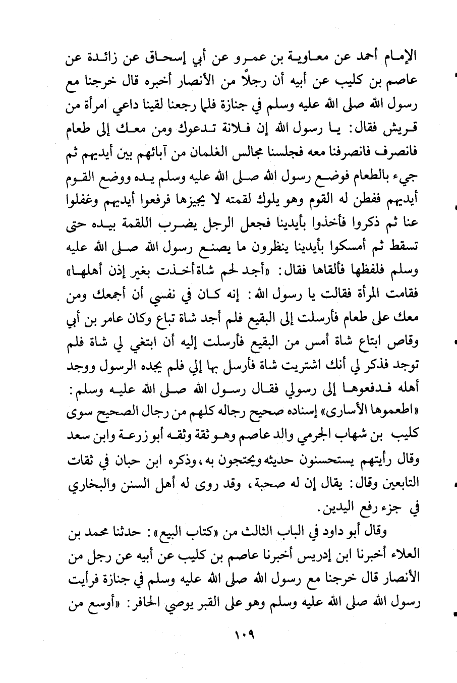 الإمام أحمد عن معاوية بن عمرو عن أبي إسحاق عن زائدة عن عاصم بن كليب عن أبيه أن رجلاً من الأنصار أخبره قال خرجنا مع رسول الله - صلى الله عليه وسلم - في جنازة فلما رجعنا لقينا داعي امرأة من قريش فقال: يا رسول الله إن فلانة تدعوك ومن معك إلى طعام فانصرف فانصرفنا معه فجلسنا مجالس الغلمان من آبائهم بين أيديهم ثم جيء بالطعام فوضع رسول الله - صلى الله عليه وسلم - يده ووضع القوم أيديهم ففطن له القوم وهو يلوك لقمته لا يجيزها فرفعوا أيديهم وغفلوا عنا ثم ذكروا فأخذوا بأيدينا فجعل الرجل يضرب اللقمة بيده حتى تسقط ثم أمسكوا بأيدينا ينظرون ما يصنع رسول الله - صلى الله عليه وسلم - فلفظها فألقاها فقال: «أجد لحم شاة أخذت بغير إذن أهلها» فقامت المرأة فقالت يا رسول الله: إنه كان في نفسي أن أجمعك ومن معك على طعام فأرسلت إلى البقيع فلم أجد شاة تباع وكان عامر بن أبي وقاص ابتاع شاة أمس من البقيع فأرسلت إليه أن ابتغي لي شاة فلم توجد فذكر لي أنك اشتريت شاة فأرسل بها إليَّ فلم يجده الرسول ووجد أهله فدفعوها إلى رسولي فقال رسول الله - صلى الله عليه وسلم -: «اطعموها الأسارى» إسناده صحيح رجاله كلهم من رجال الصحيح سوى كليب بن شهاب الجرمي والد عاصم وهو ثقة وثقه أبو زرعة وابن سعد وقال رأيتهم يستحسنون حديثه ويحتجون به, وذكره ابن حبان في ثقات التابعين وقال: يقال إن له صحبة, وقد روى له أهل السنن والبخاري في جزء رفع اليدين.