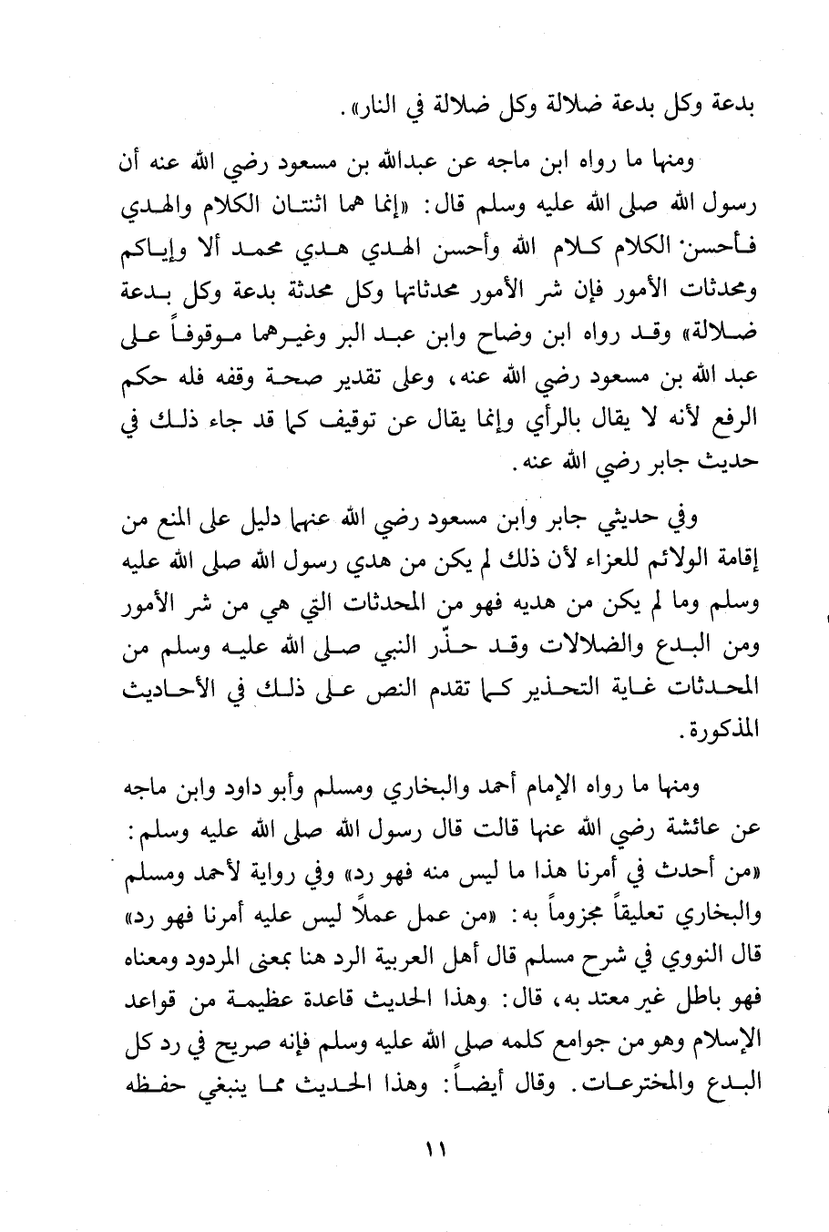 ومنها ما رواه ابن ماجه عن عبد الله بن مسعود رضي الله عنه أن رسول الله - صلى الله عليه وسلم - قال: «إنما هما اثنتان الكلام والهدي فأحسن الكلام كلام الله وأحسن الهدي هدي محمد ألا وإياكم ومحدثات الأمور فإن شر الأمور محدثاتها وكل محدثة بدعة وكل بدعة ضلالة» وقد رواه ابن وضاح وابن عبد البر وغيرهما موقوفاً على عبد الله بن مسعود رضي الله عنه, وعلى تقدير صحة وقفه فله حكم الرفع لأنه لا يقال بالرأي وإنما يقال عن توقيف كما قد جاء ذلك في حديث جابر رضي الله عنه.