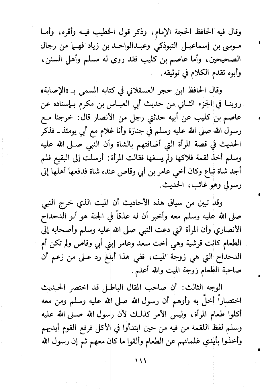 الوجه الثالث: أن صاحب المقال الباطل قد اختصر الحديث اختصاراً أخلَّ به وأوهم أن رسول الله - صلى الله عليه وسلم - ومن معه أكلوا طعام المرأة, وليس الأمر كذلك لأن رسول الله - صلى الله عليه وسلم - لفظ اللقمة من فيه من حين ابتدأوا في الأكل فرفع القوم أيديهم وأخذوا بأيدي غلمانهم عن الطعام وألقوا ما كان معهم ثم إن رسول الله
