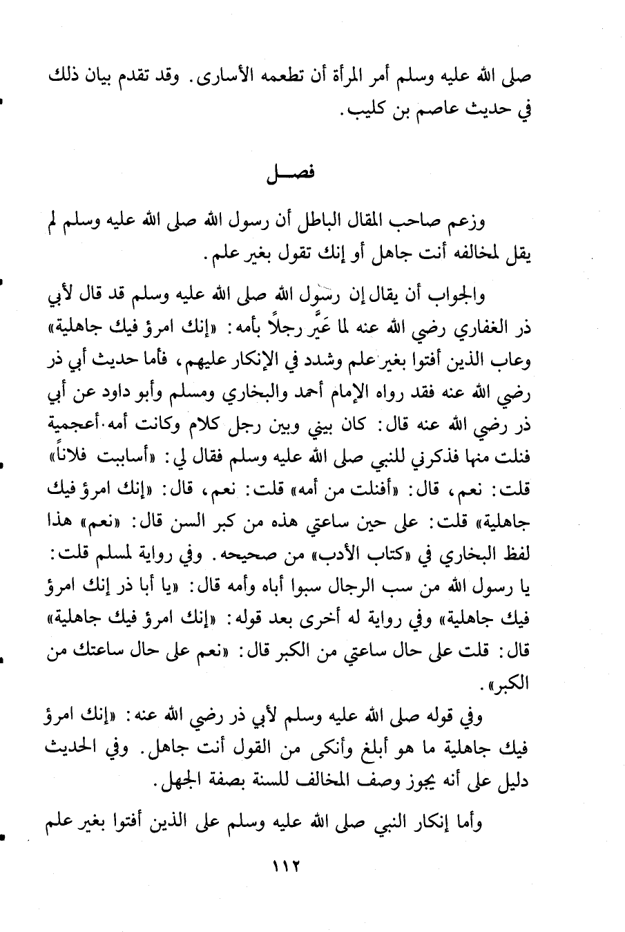 والجواب أن يقال إن رسول الله - صلى الله عليه وسلم - قد قال لأبي ذر الغفاري رضي الله عنه لما عَيَّر رجلاً بأمه: «إنك امرؤ فيك جاهلية» وعاب الذين أفتوا بغير علم وشدد في الإنكار عليهم, فأما حديث أبي ذر رضي الله عنه فقد رواه الإمام أحمد والبخاري ومسلم وأبو داود عن أبي ذر رضي الله عنه قال: كان بيني وبين رجل كلام وكانت أمه أعجمية فنلت منها فذكرني للنبي - صلى الله عليه وسلم - فقال لي: «أساببت فلاناً» قلت: نعم, قال: «أفنلت من أمه» قلت: نعم, قال: «إنك امرؤ فيك جاهلية» قلت: على حين ساعتي هذه من كبر السن قال: «نعم» هذا لفظ البخاري في «كتاب الأدب» من صحيحه. وفي رواية لمسلم قلت: يا رسول الله من سب الرجال سبوا أباه وأمه قال: «يا أبا ذر إنك امرؤ فيك جاهلية» وفي رواية له أخرى بعد قوله: «إنك امرؤ فيك جاهلية» قال: قلت على حال ساعتي من الكبر قال: «نعم على حال ساعتك من الكبر».