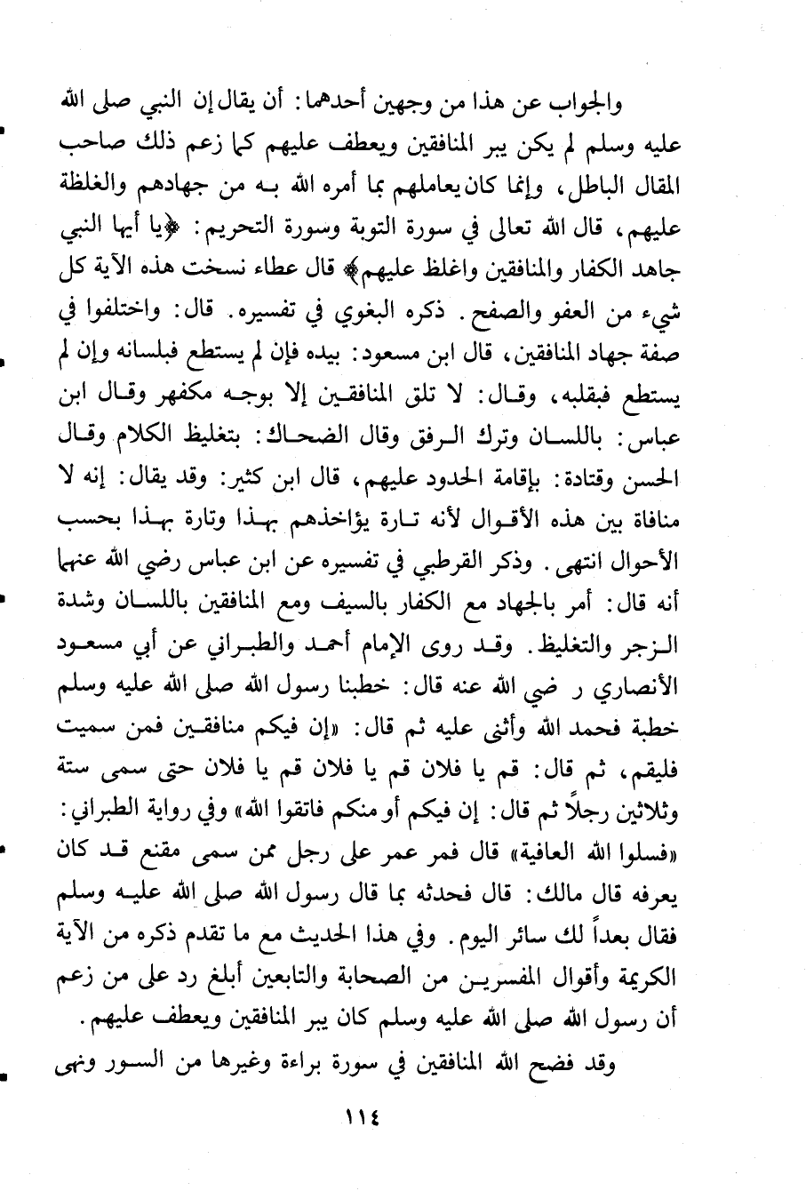 والجواب عن هذا من وجهين أحدهما: أن يقال إن النبي - صلى الله عليه وسلم - لم يكن يبر المنافقين ويعطف عليهم كما زعم ذلك صاحب المقال الباطل, وإنما كان يعاملهم بما أمره الله به من جهادهم والغلظة عليهم, قال الله تعالى في سورة التوبة وسورة التحريم: {يا أيها النبي جاهد الكفار والمنافقين واغلظ عليهم} قال عطاء نسخت هذه الآية كل شيء من العفو والصفح. ذكره البغوي في تفسيره. قال: واختلفوا في صفة جهاد المنافقين, قال ابن مسعود: بيده فإن لم يستطع فبلسانه وإن لم يستطع فبقلبه, وقال: لا تلق المنافقين إلا بوجه مكفهر وقال ابن عباس: باللسان وترك الرفق وقال الضحاك: بتغليظ الكلام وقال الحسن وقتادة: بإقامة الحدود عليهم, قال ابن كثير: وقد يقال: إنه لا منافاة بين هذه الأقوال لأنه تارة يؤاخذهم بهذا وتارة بهذا بحسب الأحوال انتهى. وذكر القرطبي في تفسيره عن ابن عباس رضي الله عنهما أنه قال: أمر بالجهاد مع الكفار بالسيف ومع المنافقين باللسان وشدة الزجر والتغليظ. وقد روى الإمام أحمد والطبراني عن أبي مسعود الأنصاري رضي الله عنه قال: خطبنا رسول الله - صلى الله عليه وسلم - خطبة فحمد الله وأثنى عليه ثم قال: «إن فيكم منافقين فمن سميت فليقم, ثم قال: قم يا فلان قم يا فلان قم يا فلان حتى سمى ستة وثلاثين رجلاً ثم قال: إن فيكم أو منكم فاتقوا الله» وفي رواية الطبراني: «فسلوا الله العافية» قال فمر عمر على رجل ممن سمى مقنع قد كان يعرفه قال مالك: قال فحدثه بما قال رسول الله - صلى الله عليه وسلم - فقال بعداً لك سائر اليوم. وفي هذا الحديث ما مع تقدم ذكره من الآية الكريمة وأقوال المفسرين من الصحابة والتابعين أبلغ رد على من زعم أن رسول الله - صلى الله عليه وسلم - كان يبر المنافقين ويعطف عليهم.
