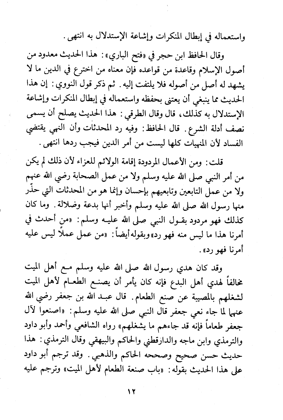 وقد كان هدي رسول الله - صلى الله عليه وسلم - مع أهل الميت مخالفاً لهدي أهل البدع فإنه كان يأمر أن يصنع الطعام لأهل الميت لشغلهم بالمصيبة عن صنع الطعام. قال عبد الله بن جعفر رضي الله عنهما لما جاء نعي جعفر قال النبي - صلى الله عليه وسلم -: «اصنعوا لآل جعفر طعاماً فإنه قد جاءهم ما يشغلهم» رواه الشافعي وأحمد وأبو داود والترمذي وابن ماجه والدارقطني والحاكم والبيهقي وقال الترمذي: هذا حديث حسن صحيح وصححه الحاكم والذهبي. وقد ترجم أبو داود على هذا الحديث بقوله: «باب صنعة الطعام لأهل الميت» وترجم عليه