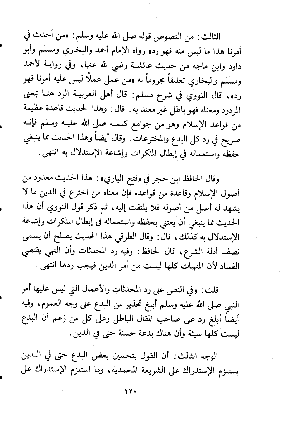 الثالث: من النصوص قوله - صلى الله عليه وسلم -: «من أحدث في أمرنا هذا ما ليس منه رد» رواه الإمام أحمد والبخاري ومسلم وأبو داود وابن ماجه من حديث عائشة رضي الله عنها, وفي رواية لأحمد ومسلم والبخاري تعليقاً مجزوما به «من عمل عملاً ليس عليه أمرنا فهو رد» , قال النووي في شرح مسلم: قال أهل العربية الرد هنا بمعنى المردود ومعناه فهو باطل غير معتد به. قال: وهذا الحديث قاعدة عظيمة من قواعد الإسلام وهو من جوامع كلمه - صلى الله عليه وسلم - فإنه صريح في رد كل البدع والمخترعات. وقال أيضاً وهذا الحديث مما ينبغي حفظه واستعماله في إبطال المنكرات وإشاعة الاستدلال به انتهى.