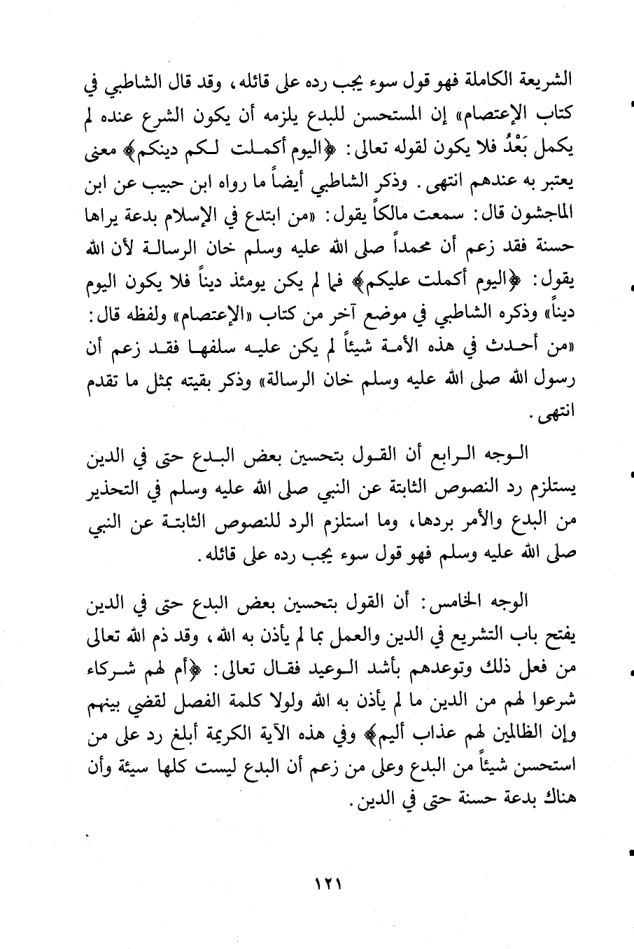 الشريعة الكاملة فهو قول سوء يجب رده على قائله, وقد قال الشاطبي في كتاب «الاعتصام» إن المستحسن للبدع يلزمه أن يكون الشرع عنده لم يكمل بَعْدُ فلا يكون لقوله تعالى: {اليوم أكملت لكم دينكم} معنى يعتبر به عندهم انتهى. وذكر الشاطبي أيضاً ما رواه ابن حبيب عن ابن الماجشون قال: سمعت مالكاً يقول: «من ابتدع في الإسلام بدعة يراها حسنة فقد زعم أن محمداً - صلى الله عليه وسلم - خان الرسالة لأن الله يقول: {اليوم أكملت لكم دينكم} فما لم يكن يومئذ ديناً فلا يكون اليوم ديناً» وذكره الشاطبي في موضع آخر من كتاب «الاعتصام» ولفظه قال: «من أحدث في هذه الأمة شيئاً لم يكن عليه سلفها فقد زعم أن رسول الله - صلى الله عليه وسلم - خان الرسالة» وذكر بقيته بمثل ما تقدم انتهى.