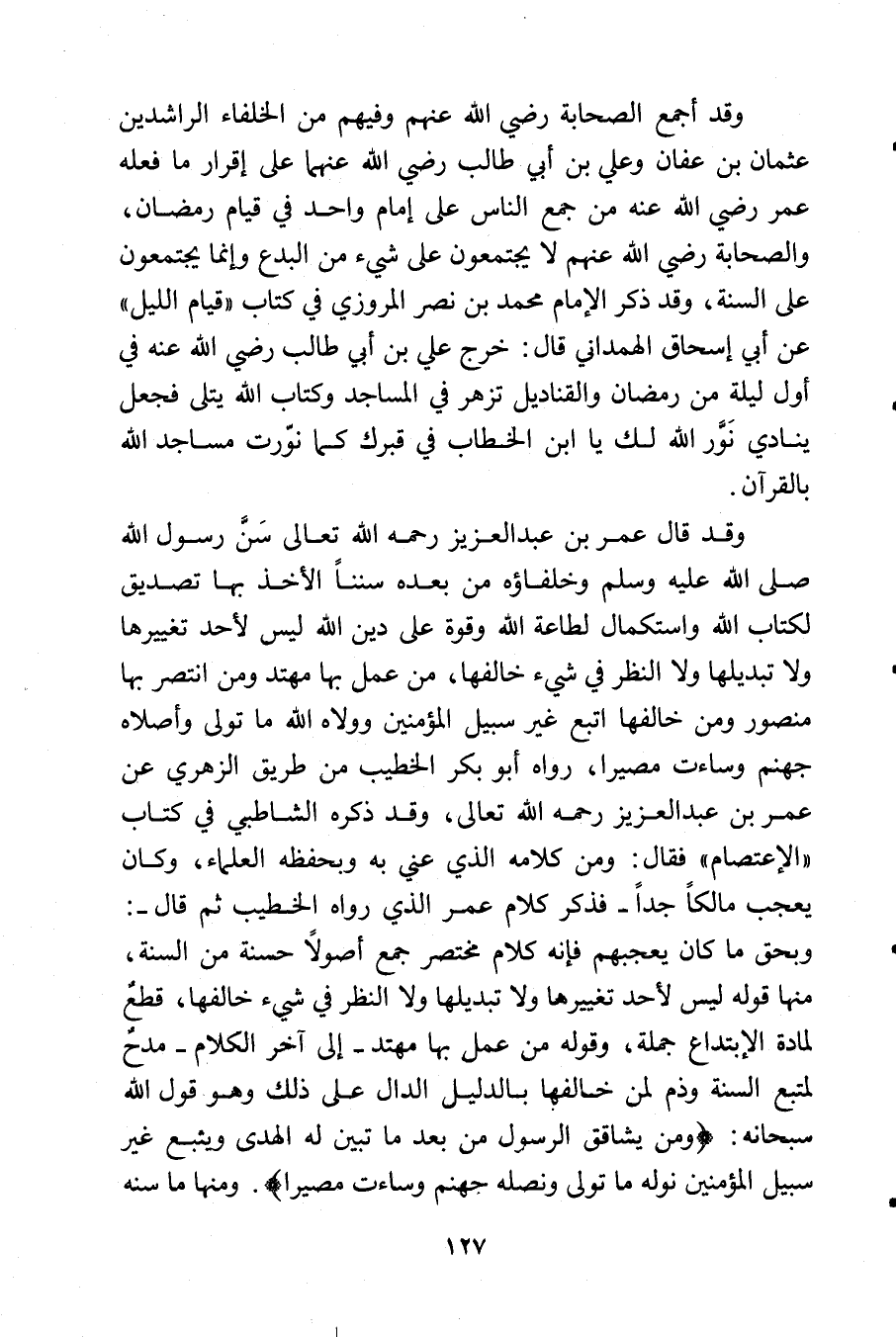 وقد قال عمر بن عبد العزيز رحمه الله تعالى سَنَّ رسول الله - صلى الله عليه وسلم - وخلفاؤه من بعده سنناً الأخذ بها تصديق لكتاب الله واستكمال لطاعة الله وقوة على دين الله ليس لأحد تغييرها ولا تبديلها ولا النظر في شيء خالفها, من عمل بها مهتد ومن انتصر بها منصور ومن خالفها اتبع غير سبيل المؤمنين وولاه الله ما تولى وأصلاه جهنم وساءت مصيرا, رواه أبو بكر الخطيب من طريق الزهري عن عمر بن عبد العزيز رحمه الله تعالى, وقد ذكره الشاطبي في كتاب «الاعتصام» فقال: ومن كلامه الذي عني به وبحفظه العلماء, وكان يعجب مالكاً جداً - فذكر كلام عمر الذي رواه الخطيب ثم قال -: وبحق ما كان يعجبهم فإنه كلام مختصر جمع أصولاً حسنة من السنة, منها قوله ليس لأحد تغييرها ولا تبديها ولا النظر في شيء خالفها, قطعٌ لمادة الابتداع جملة, وقوله من عمل بها مهتد - إلى آخر الكلام - مدحٌ لمتبع السنة وذم لمن خالفها بالدليل الدال على ذلك وهو قول الله سبحانه: {ومن يشاقق الرسول من بعد ما تبين له الهدى ويتبع غير سبيل المؤمنين نوله ما تولى ونصله جهنم وساءت مصيرا}. ومنها ما سنه