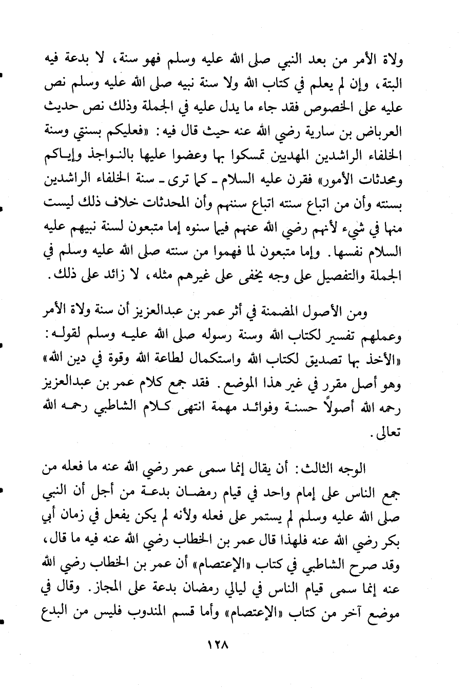 ولاة الأمر من بعد النبي - صلى الله عليه وسلم - فهو سنة, لا بدعة فيه البتة, وإن لم يعلم في كتاب الله ولا سنة نبيه - صلى الله عليه وسلم - نص عليه على الخصوص فقد جاء ما يدل عليه في الجملة وذلك نص حديث العرباض بن سارية رضي الله عنه حيث قال فيه: «فعليكم بسنتي وسنة الخلفاء الراشدين المهديين تمسكوا بها وعضوا عليها بالنواجذ وإياكم ومحدثات الأمور» فقرن عليه السلام - كما ترى - سنة الخلفاء الراشدين بسنته وأن من اتباع سنته اتباع سننهم وأن المحدثات خلاف ذلك ليست منها في شيء لأنهم رضي الله عنهم فيما سنوه إما متبعون لسنة نبيهم عليه السلام نفسها. وإما متبعون لما فهموا من سنته - صلى الله عليه وسلم - في الجملة والتفصيل على وجه يخفى على غيرهم مثله, لا زائد على ذلك.