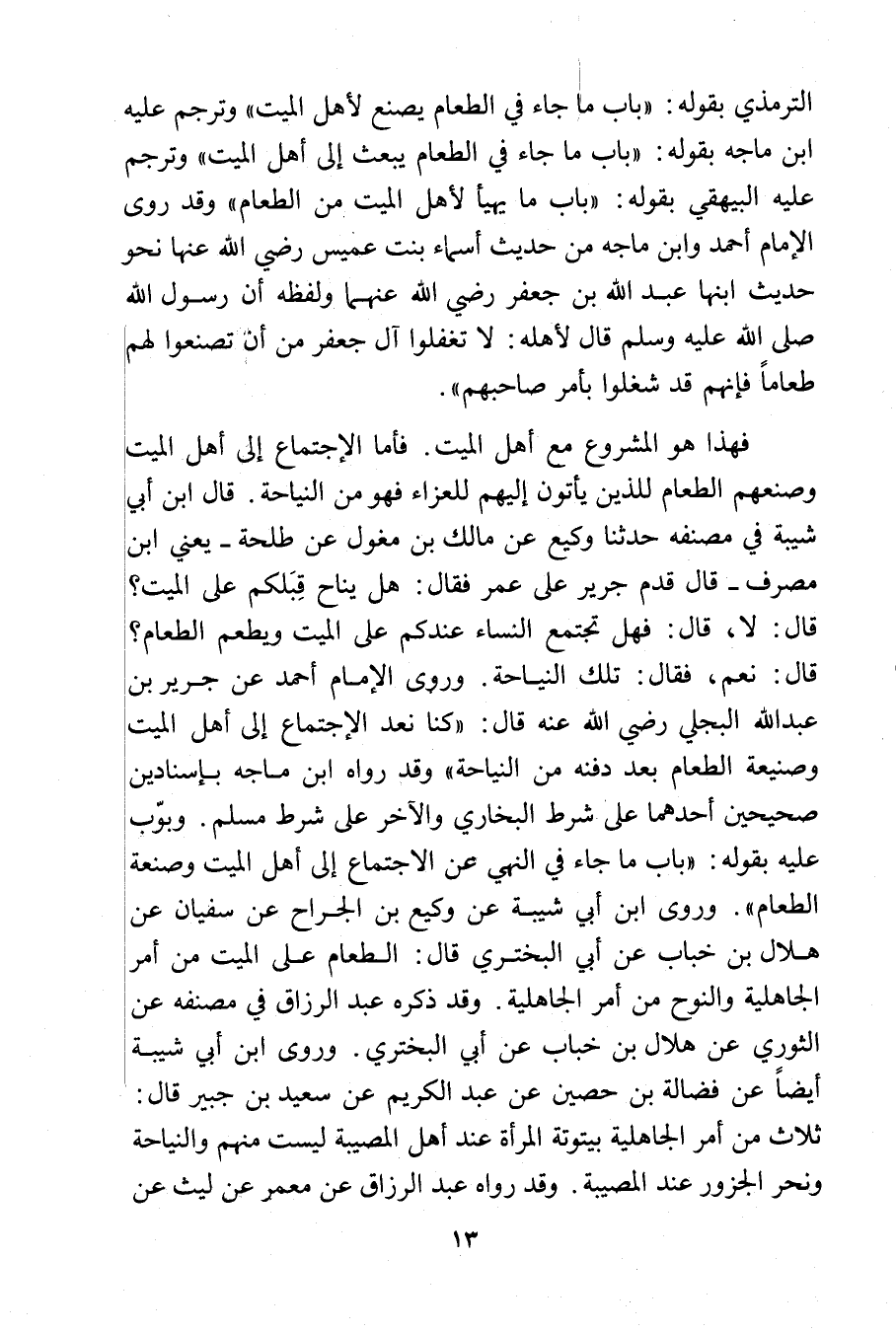 فهذا هو المشروع مع أهل الميت. فأما الاجتماع إلى أهل الميت وصنعهم الطعام للذين يأتون إليهم للعزاء فهو من النياحة. قال ابن أبي شيبة في مصنفه حدثنا وكيع عن مالك بن مغول عن طلحة - يعني ابن مصرف - قال قدم جرير على عمر فقال: هل يناح قِبَلكم على الميت؟ قال: لا, قال: فهل تجتمع النساء عندكم على الميت ويطعم الطعام؟ قال: نعم, فقال: تلك النياحة. وروى الإمام أحمد عن جرير بن عبد الله البجلي رضي الله عنه قال: «كنا نعد الاجتماع إلى أهل الميت وصنيعة الطعام بعد دفنه من النياحة» وقد رواه ابن ماجه بإسنادين صحيحين أحدهما على شرط البخاري والآخر على شرط مسلم. وبوّب عليه بقوله: «باب ما جاء في النهي عن الاجتماع إلى أهل الميت وصنعة الطعام». وروى ابن أبي شيبة عن وكيع بن الجراح عن سفيان عن هلال بن خباب عن أبي البختري قال: الطعام على الميت من أمر الجاهلية والنوح من أمر الجاهلية. وقد ذكره عبد الرزاق في مصنفه عن الثوري عن هلال بن خباب عن أبي البختري. وروى ابن أبي شيبة أيضاً عن فضالة بن حصين عن عبد الكريم عن سعيد بن جبير قال: ثلاث عن أمر الجاهلية بيتوتة المرأة عند أهل المصيبة ليست منهم والنياحة ونحر الجزور عند المصيبة. وقد رواه عبد الرزاق عن معمر عن ليث عن