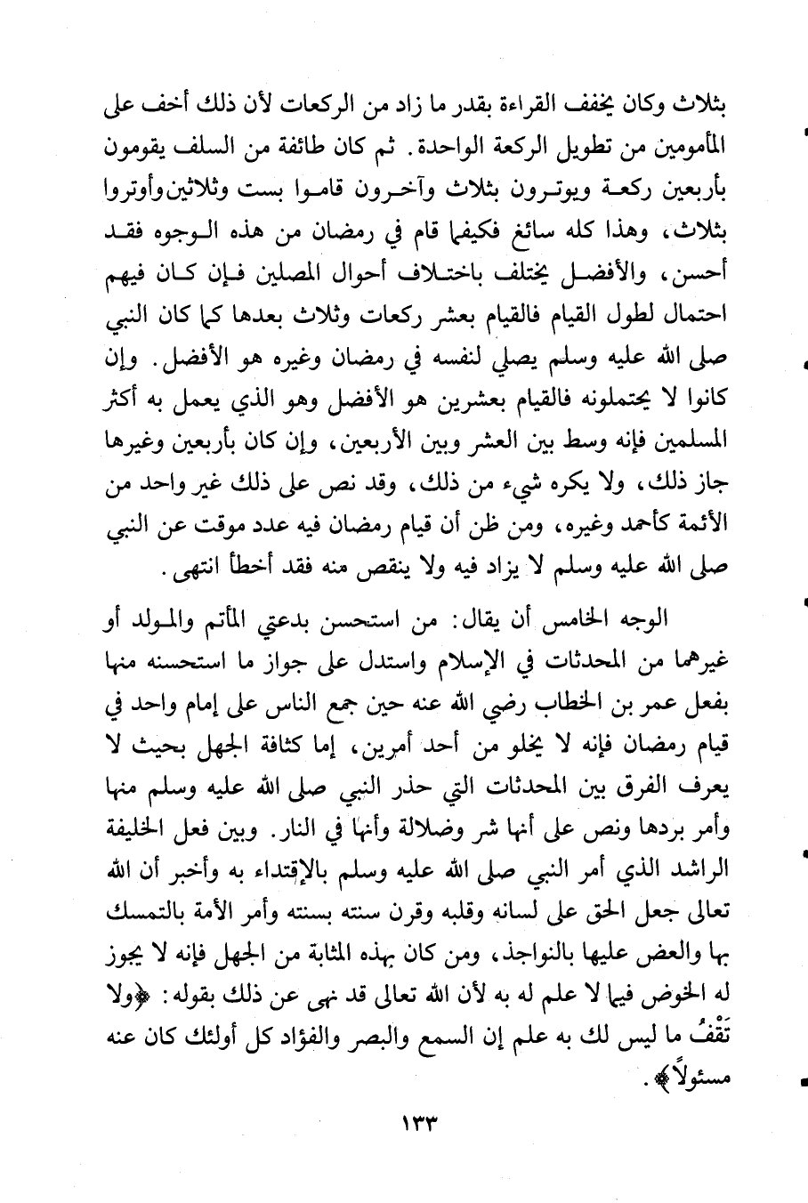 الوجه الخامس أن يقال: من استحسن بدعتي المأتم والمولد أو غيرهما من المحدثات في الإسلام واستدل على جواز ما استحسنه منها بفعل عمر بن الخطاب رضي الله عنه حين جمع الناس على إمام واحد في قيام رمضان فإنه لا يخلو من أحد أمرين, إما كثافة الجهل بحيث لا يعرف الفرق بين المحدثات التي حذر النبي صلى الله عليه وسلم منها وأمر بردها ونص على أنها شر وضلالة وأنها في النار. وبين فعل الخليفة الراشد الذي أمر النبي - صلى الله عليه وسلم - بالاقتداء به وأخبر أن الله جعل الحق على لسانه وقلبه وقرن سنته بسنته وأمر الأمة بالتمسك بها والعض عليها بالنواجذ, ومن كان بهذه المثابة من الجهل فإنه لا يجوز له الخوض فيما لا علم له به لأن الله تعالى قد نهى عن ذلك بقوله: {ولا تَقْفُ ما ليس لك به علم إن السمع والبصر والفؤاد كل أولئك كان عنه مسئولاً}.