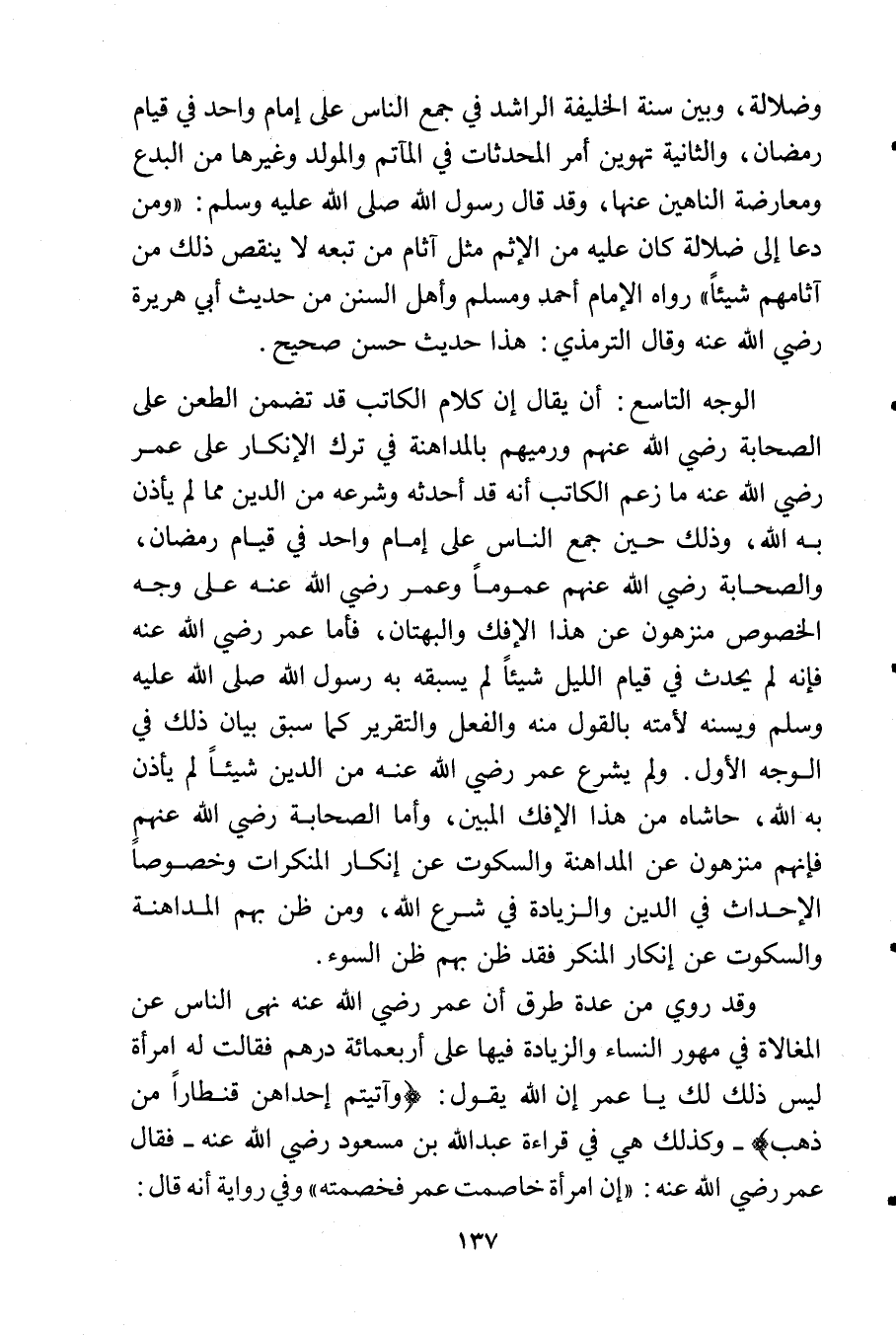 وضلالة, وبين سنة الخليفة الراشد في جمع الناس على إمام واحد في قيام رمضان, والثانية تهوين أمر المحدثات في المآتم والمولد وغيرها من البدع ومعارضة الناهين عنها, وقد قال رسول الله - صلى الله عليه وسلم -: «ومن دعا إلى ضلالة كان عليه من الإثم مثل آثام من تبعه لا ينقص ذلك من آثامهم شيئاً» رواه الإمام أحمد ومسلم وأهل السنن من حديث أبي هريرة رضي الله عنه وقال الترمذي: هذا حديث حسن صحيح.