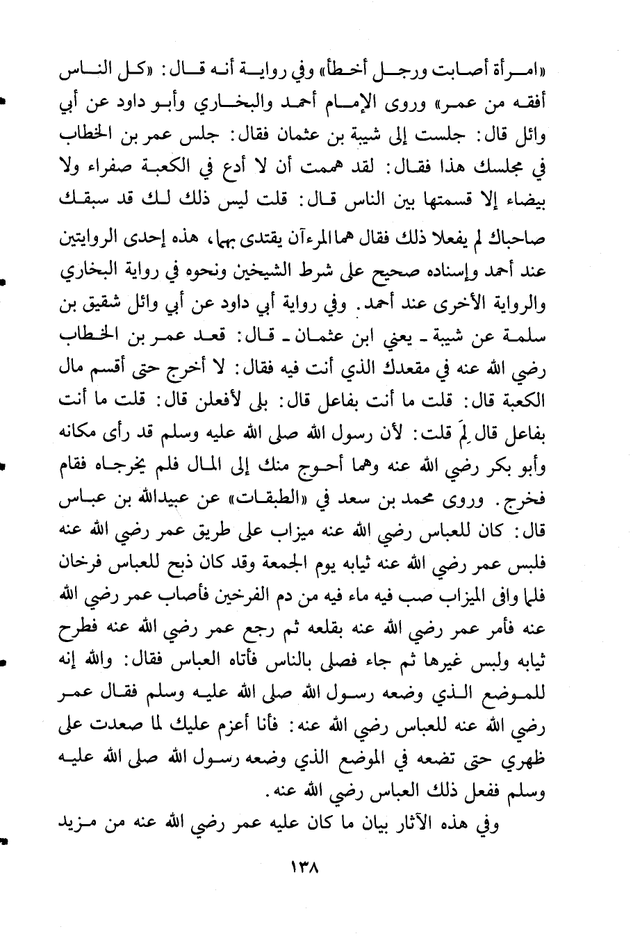 «امرأة أصابت ورجل أخطأ» وفي رواية أنه قال: «كل الناس أفقه من عمر» وروى الإمام أحمد والبخاري وأبو داود عن أبي وائل قال: جلست إلى شيبة بن عثمان فقال: جلس عمر بن الخطاب في مجلسك هذا فقال: لقد هممت أن لا أدع في الكعبة صفراء ولا بيضاء إلا قسمتها بين الناس قال: قلت ليس ذلك لك قد سبقك صاحباك لم يفعلا ذلك فقال هما المرءآن يقتدي بهما, هذه إحدى الروايتين عند أحمد وإسناده صحيح على شرط الشيخين ونحوه في رواية البخاري والرواية الأخرى عند أحمد. وفي رواية أبي داود عن أبي وائل شقيق بن سلمة عن شيبة - يعني ابن عثمان - قال: قعد عمر بن الخطاب رضي الله عنه في مقعدك الذي أنت فيه فقال: لا أخرج حتى أقسم مال الكعبة قال: قلت ما أنت بفاعل قال: بلى لأفعلن قال: قلت ما أنت بفاعل قال لِمَ قلت: لأن رسول الله - صلى الله عليه وسلم - قد رأى مكانه وأبو بكر رضي الله عنه وهما أحوج منك إلى المال فلم يخرجاه فقام فخرج.