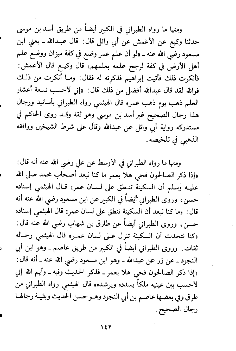 ومنها ما رواه الطبراني في الكبير أيضاً من طريق أسد بن موسى حدثنا وكيع عن الأعمش عن أبي وائل قال: قال عبد الله - يعني ابن مسعود رضي الله عنه - «لو أن علم عمر وضع في كفة ميزان ووضع علم أهل الأرض في كفة لرجح علمه بعلمهم» قال وكيع قال الأعمش: فأنكرت ذلك فأتيت إبراهيم فذكرته له فقال: وما أنكرت من ذلك فو الله لقد قال عبد الله أفضل من ذلك قال: «إني لأحسب تسعة أعشار العلم ذهب يوم ذهب عمر» قال الهيثمي رواه الطبراني بأسانيد ورجال هذا رجال الصحيح غير أسد بن موسى وهو ثقة وقد روى الحاكم في مستدركه رواية أبي وائل عن عبد الله وقال على شرط الشيخين ووافقه الذهبي في تلخيصه.