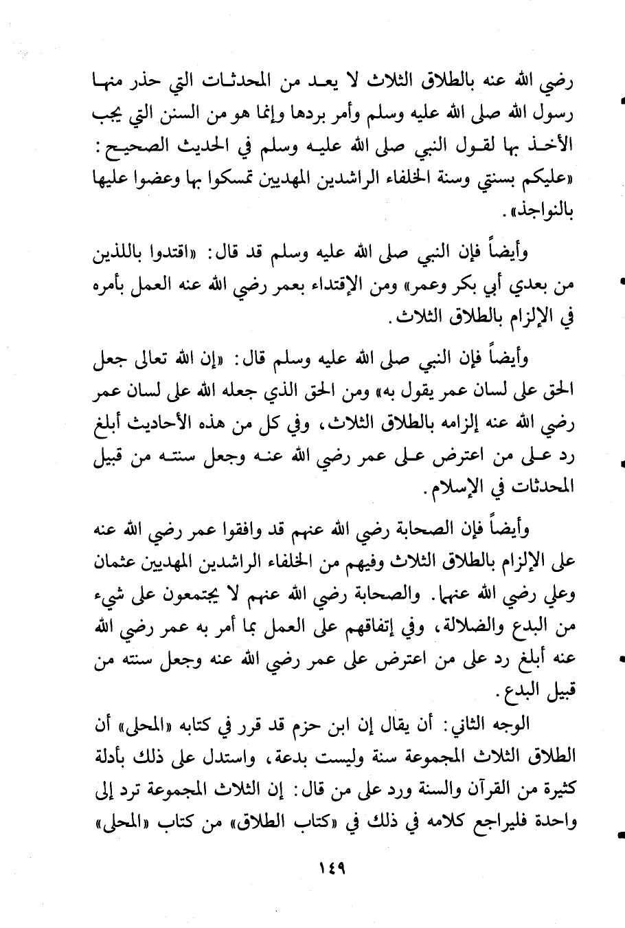 رضي الله عنه بالطلاق الثلاث لا يعد من المحدثات التي حذر منها رسول الله - صلى الله عليه وسلم - وأمر بردها وإنما هو من السنن التي يجب الأخذ بها لقول النبي - صلى الله عليه وسلم - في الحديث الصحيح: «عليكم بسنتي وسنة الخلفاء الراشدين المهديين تمسكوا بها وعضوا عليها بالنواجذ».