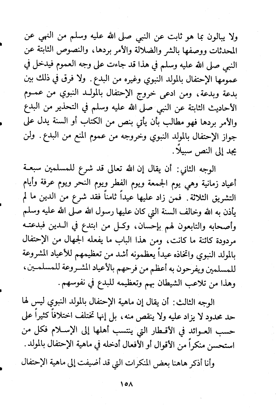 ولا يبالون بما هو ثابت عن النبي - صلى الله عليه وسلم - من النهي عن المحدثات ووصفها بالشر والضلالة والأمر بردها, والنصوص الثابتة عن النبي - صلى الله عليه وسلم - في هذا قد جاءت على وجه العموم فيدخل في عمومها الاحتفال بالمولد النبوي وغيره من البدع. ولا فرق في ذلك بين بدعة وبدعة, ومن ادعى خروج الاحتفال بالمولد النبوي من عموم الأحاديث الثابتة عن النبي - صلى الله عليه وسلم - في التحذير من البدع والأمر بردها فهو مطالب بأن يأتي بنص من الكتاب أو السنة يدل على جواز الاحتفال بالمولد النبوي وخروجه من عموم المنع من البدع. ولن يجد إلى النص سبيلاً.