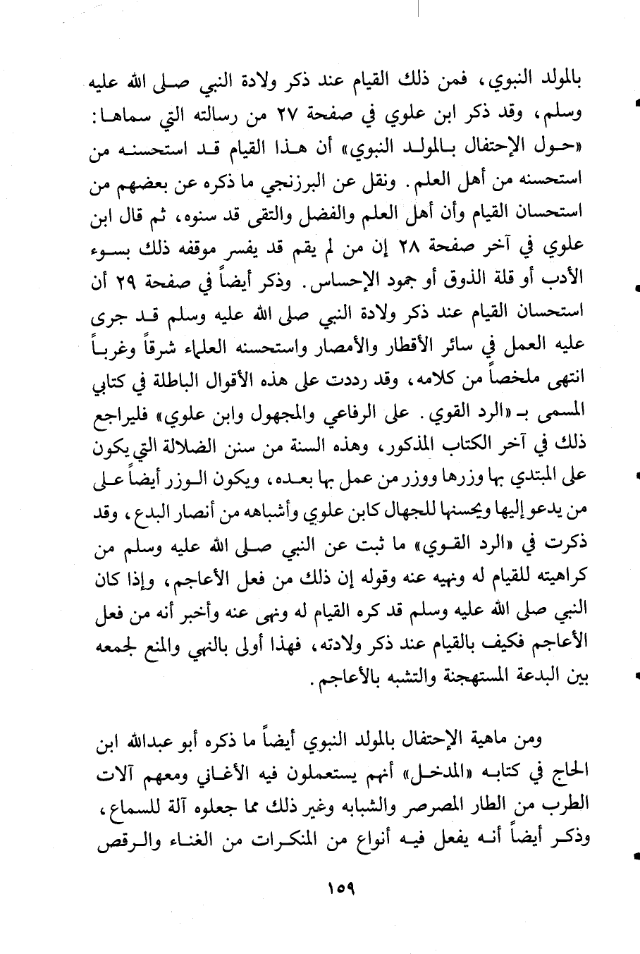 بالمولد النبوي, فمن ذلك القيام عند ذكر ولادة النبي - صلى الله عليه وسلم - , وقد ذكر ابن علوي في صفحة 27 من رسالته التي سماها: «حول الاحتفال بالمولد النبوي» أن هذا القيام قد استحسنه من استحسنه من أهل العلم. ونقل عن البرزنجي ما ذكره عن بعضهم من استحسان القيام وأن أهل العلم والفضل والتقى قد سنوه, ثم قال ابن علوي في آخر صفحة 28 إن من لم يقم قد يفسر موقفه ذلك بسوء الأدب أو قلة الذوق أو جمود الإحساس. وذكر أيضاً في صفحة 29 أن استحسان القيام عند ذكر ولادة النبي - صلى الله عليه وسلم - قد جرى عليه العمل في سائر الأقطار والأمصار واستحسنه العلماء شرقاً وغرباً انتهى ملخصاً من كلامه, وقد رددت على هذه الأقوال الباطلة في كتابي المسمى بـ «الرد القوي. على الرفاعي والمجهول وابن علوي» فليراجع ذلك في آخر الكتاب المذكور, وهذه السنة من سنن الضلالة التي يكون على المبتدي بها وزرها ووزر من عمل بها بعده, ويكون الوزر أيضاً على من يدعو إليها ويحسنها للجهال كابن علوي وأشباهه من أنصار البدع, وقد ذكرت في «الرد القوي» ما ثبت عن النبي - صلى الله عليه وسلم - من كراهيته للقيام له ونهيه عنه وقوله إن ذلك من فعل الأعاجم, وإذا كان النبي - صلى الله عليه وسلم - قد كره القيام له ونهى عنه وأخبر أنه من فعل الأعاجم فكيف بالقيام عند ذكر ولادته, فهذا أولى بالنهي والمنع لجمعه بين البدعة المستهجنة والتشبه بالأعاجم.