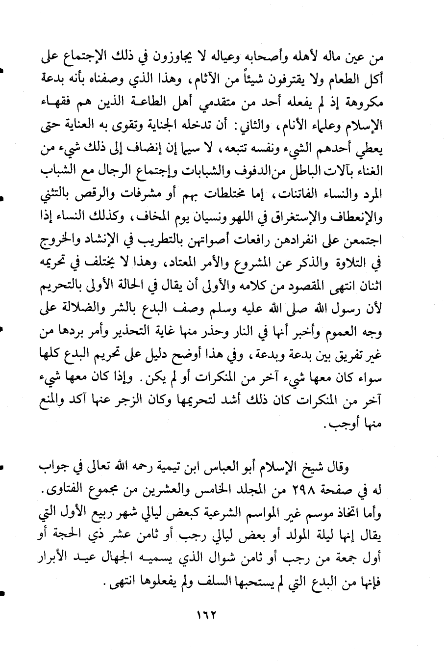 وقال شيخ الإسلام أبو العباس ابن تيمية رحمه الله تعالى في جواب له في صفحة 298 من المجلد الخامس والعشرين من مجموع الفتاوى. وأما اتخاذ موسم غير المواسم الشرعية كبعض ليالي شهر ربيع الأول التي يقال إنها ليلة المولد أو بعض ليالي رجب أو ثامن عشر ذي الحجة أو أول جمعة من رجب أو ثامن شوال الذي يسميه الجهال عيد الأبرار فإنها من البدع التي لم يستحبها السلف ولم يفعلوها انتهى.