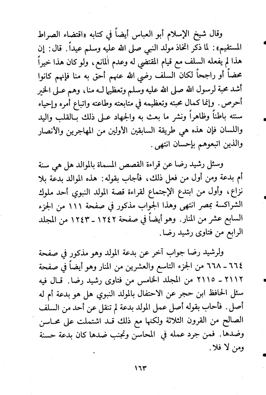 وقال شيخ الإسلام أبو العباس أيضاً في كتابه «اقتضاء الصراط المستقيم»: لما ذكر اتخاذ مولد النبي - صلى الله عليه وسلم - عيداً. قال: إن هذا لم يفعله السلف مع قيام المقتضي له وعدم المانع, ولو كان هذا خيراً محضاً أو راجحاً لكان السلف رضي الله عنهم أحق به منا فإنهم كانوا أشد محبة لرسول الله - صلى الله عليه وسلم - وتعظيما له منا, وهم على الخير أحرص. وإنما كمال محبته وتعظيمه في متابعته وطاعته واتباع أمره وإحياء سنته باطناً وظاهراً ونشر ما بعث به والجهاد على ذلك بالقلب واليد واللسان فإن هذه هي طريقة السابقين الأولين من المهاجرين والأنصار والذين اتبعوهم بإحسان انتهى.