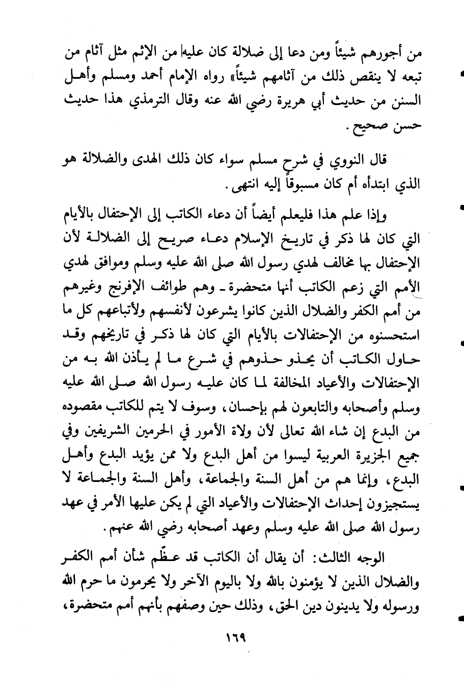 وإذا علم هذا فليعلم أيضاً أن دعاء الكاتب إلى الاحتفال بالأيام التي كان لها ذكر في تاريخ الإسلام دعاء صريح إلى الضلالة لأن الاحتفال بها مخالف لهدي رسول الله - صلى الله عليه وسلم - وموافق لهدي الأمم التي زعم الكاتب أنها متحضرة - وهم طوائف الإفرنج وغيرهم من أمم الكفر والضلال الذين كانوا يشرعون لأنفسهم ولأتباعهم كل ما استحسنوه من الاحتفالات بالأيام التي كان لها ذكر في تاريخهم وقد حاول الكاتب أن يحذو حذوهم في شرع ما لم يأذن الله به من الاحتفالات والأعياد المخالفة لما كان عليه رسول الله - صلى الله عليه وسلم - وأصحابه والتابعون لهم بإحسان, وسوف لا يتم للكاتب مقصوده من البدع إن شاء الله تعالى لأن ولاة الأمور في الحرمين الشريفين وفي جميع الجزيرة العربية ليسوا من أهل البدع ولا ممن يؤيد البدع وأهل البدع, وإنما هم من أهل السنة والجماعة, وأهل السنة والجماعة لا يستجيزون إحداث الاحتفالات والأعياد التي لم يكن عليها الأمر في عهد رسول الله - صلى الله عليه وسلم - وعهد أصحابه رضي الله عنهم.