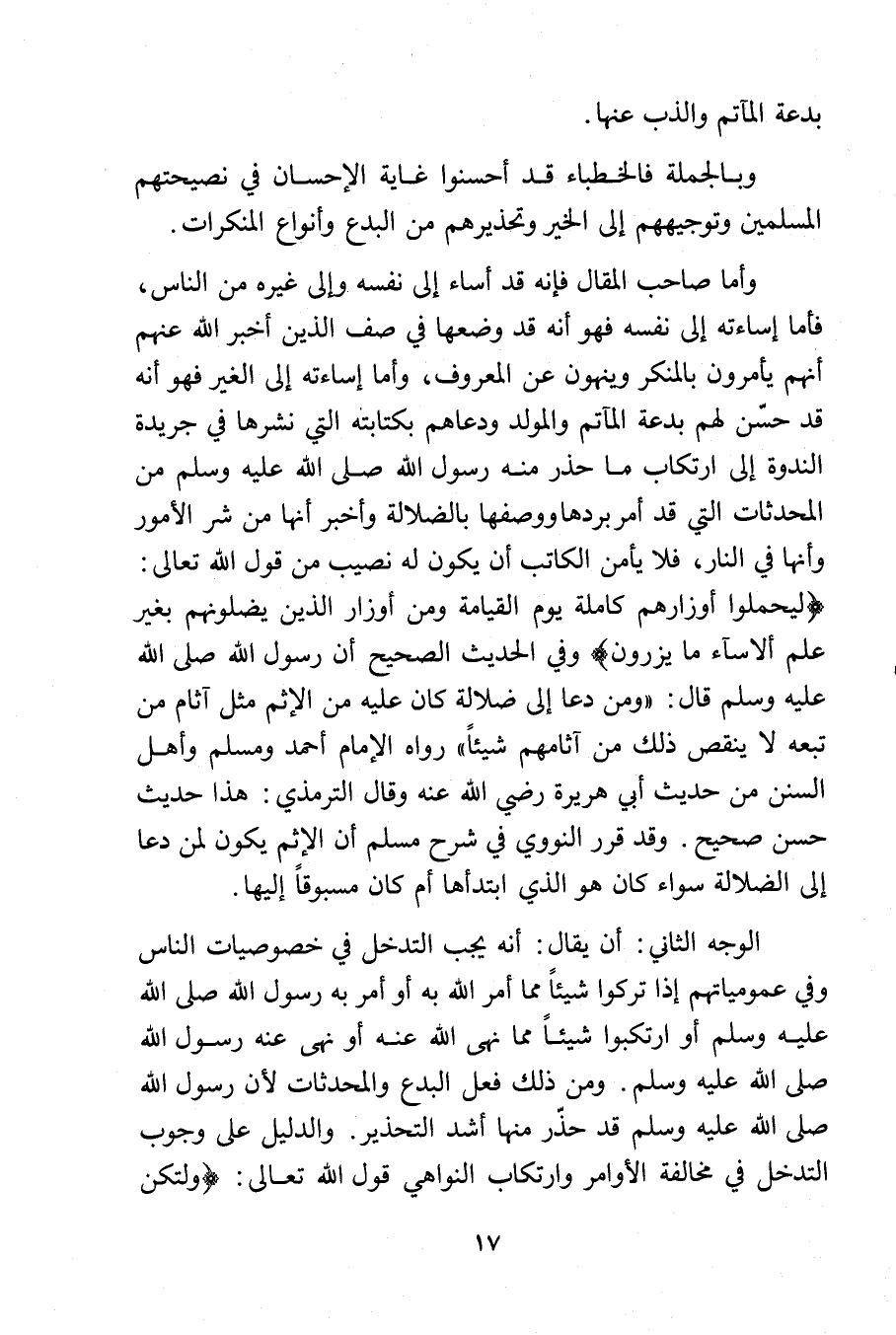 وأما صاحب المقال فإنه قد أساء إلى نفسه وإلى غيره من الناس, فأما إساءته إلى نفسه فهو أنه قد وضعها في صف الذين أخبر الله عنهم أنهم يأمرون بالمنكر وينهون عن المعروف, وأما إساءته إلى الغير فهو أنه قد حسّن لهم بدعة المآتم والمولد ودعاهم بكتابته التي نشرها في جريدة الندوة إلى ارتكاب ما حذر منه رسول الله - صلى الله عليه وسلم - من المحدثات التي قد أمر بردها ووصفها بالضلالة وأخبر أنها من شر الأمور وأنها في النار, فلا يأمن الكاتب أن يكون له نصيب من قول الله تعالى: {ليحملوا أوزارهم كاملة يوم القيامة ومن أوزار الذين يضلونهم بغير علم ألا سآء ما يرزون} وفي الحديث الصحيح أن رسول الله - صلى الله عليه وسلم - قال: «ومن دعا إلى ضلالة كان عليه من الإثم مثل آثام من تبعه لا ينقص ذلك من آثامهم شيئاً» رواه الإمام أحمد ومسلم وأهل السنن من حديث أبي هريرة رضي الله عنه وقال الترمذي: هذا حديث حسن صحيح. وقد قرر النووي في شرح مسلم أن الإثم يكون لمن دعا إلى الضلالة سواء كان هو والذي ابتدأها أم كان مسبوقاً إليها.