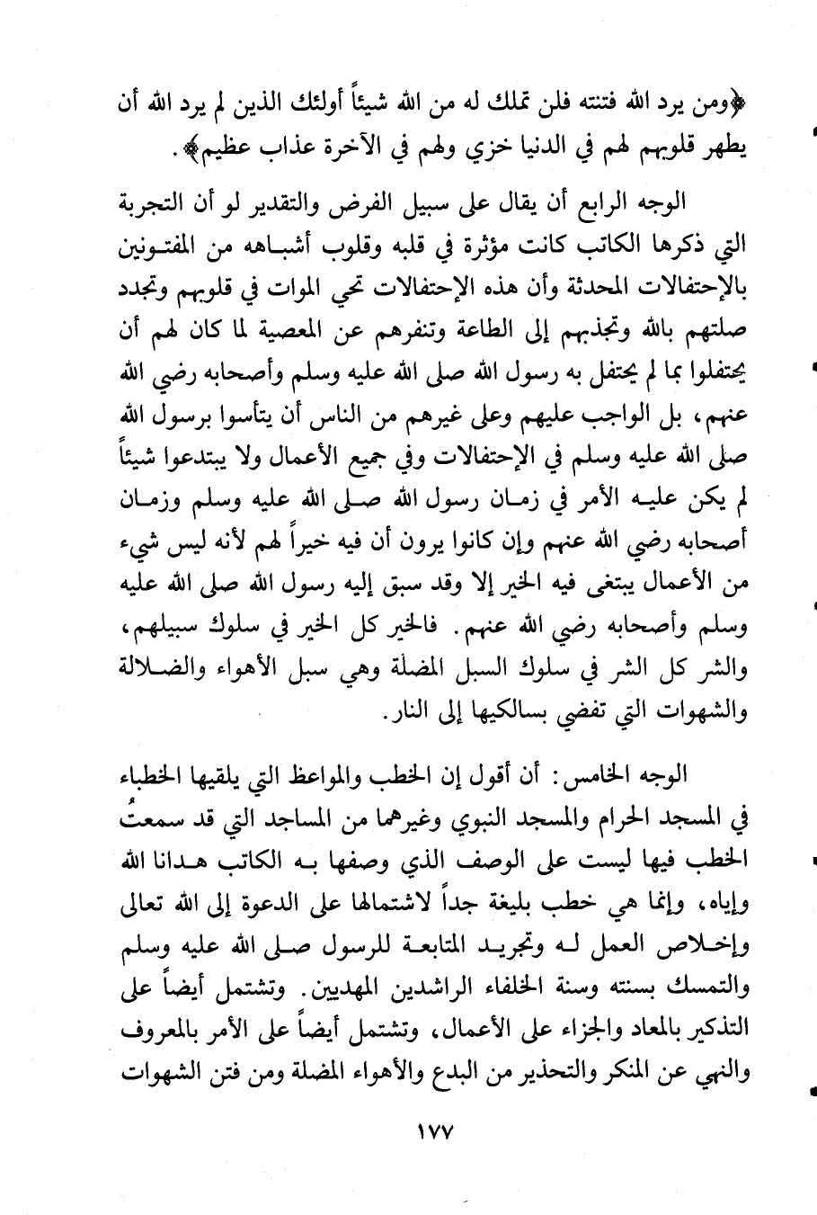 الوجه الرابع أن يقال على سبيل الفرض والتقدير لو أن التجربة التي ذكرها الكاتب كانت مؤثرة في قلبه وقلوب أشباهه من المفتونين بالاحتفالات المحدثة وأن هذه الاحتفالات تحيي الموات في قلوبهم وتجدد صلتهم بالله وتجذبهم إلى الطاعة وتنفرهم عن المعصية لما كان لهم أن يحتفلوا بما لم يحتفل به رسول الله - صلى الله عليه وسلم - وأصحابه رضي الله عنهم, بل الواجب عليهم وعلى غيرهم من الناس أن يتأسوا برسول الله - صلى الله عليه وسلم - في الاحتفالات وفي جميع الأعمال ولا يبتدعوا شيئاً لم يكن عليه الأمر في زمان رسول الله - صلى الله عليه وسلم - وزمان أصحابه رضي الله عنهم وإن كانوا يرون أن فيه خيراً لهم لأنه ليس شيء من الأعمال يبتغى فيه الخير إلا وقد سبق إليه رسول الله - صلى الله عليه وسلم - وأصحابه رضي الله عنهم. فالخير كل الخير في سلوك سبيلهم, والشر كل الشر في سلوك السبل المضلة وهي سبل الأهواء والضلالة والشهوات التي تفضي بسالكيها إلى النار.