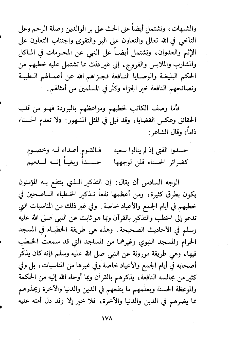 والشبهات, وتشتمل أيضاً على الحث على بر الوالدين وصلة الرحم وعلى التآخي في الله تعالى والتعاون على البر والتقوى واجتناب التعاون على الإثم والعدوان, وتشتمل أيضاً على النهي عن المحرمات في المآكل والمشارب والملابس والفروج, إلى غير ذلك مما تشتمل عليه خطبهم من الحكم البليغة والوصايا النافعة فجزاهم الله عن أعمالهم الطيبة ونصائحهم النافعة خير الجزاء وكثّر في المسلمين من أمثالهم.