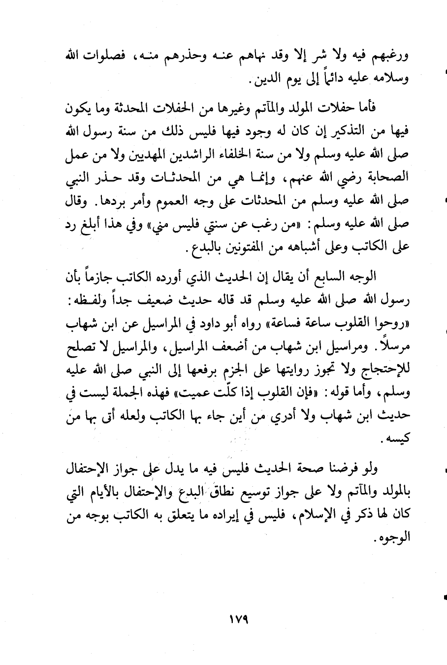 ولو فرضنا صحة الحديث فليس فيه ما يدل على جواز الاحتفال بالمولد والمآتم ولا على جواز توسيع نطاق البدع والاحتفال بالأيام التي كان لها ذكر في الإسلام, فليس في إيراده ما يتعلق به الكاتب بوجه من الوجوه.