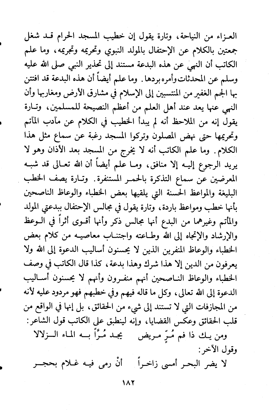 العزاء من النياحة, وتارة يقول إن خطيب المسجد الحرام قد شغل جمعتين بالكلام عن الاحتفال بالمولد النبوي وتحريمه وتجريمه, وما علم الكاتب أن النهي عن هذه البدعة مستند إلى تحذير النبي - صلى الله عليه وسلم - عن المحدثات وأمره بردها. وما علم أيضاً أن هذه البدعة قد افتتن بها الجم الغفير من المنتسبين إلى الإسلام في مشارق الأرض ومغاربها وأن النهي عنها يعد عند أهل العلم من أعظم النصيحة للمسلمين, وتارة يقول إنه من الملاحظ أنه لم يبدأ الخطيب في الكلام عن مآدب المآتم وتحريمها حتى نهض المصلون وتركوا المسجد رغبة عن سماع مثل هذا الكلام.