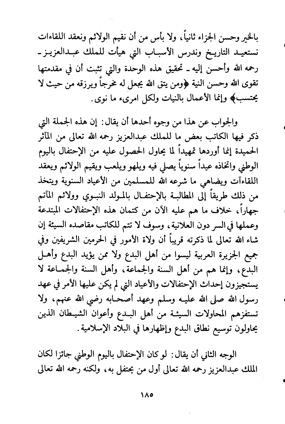 والجواب عن هذا من وجوه أحدها أن يقال: إن هذه الجملة التي ذكر فيها الكاتب بعض ما للملك عبد العزيز رحمه الله تعالى من المآثر الحميدة إنما أوردها تمهيداً لما يحاول الحصول عليه من الاحتفال باليوم الوطني واتخاذه عيداً سنوياً يصلي فيه ويلهو ويلعب ويقيم الولائم ويعقد اللقاءات ويضاهي ما شرعه الله للمسلمين من الأعياد السنوية ويتخذ من ذلك طريقاً إلى المطالبة بالاحتفال بالمولد النبوي وولائم المآتم جهاراً, خلاف ما هم عليه الآن من كتمان هذه الاحتفالات المبتدعة وعملها في السر دون العلانية, وسوف لا تتم للكاتب مقاصده السيئة إن شاء الله تعالى لما ذكرته قريباً أن ولاة الأمور في الحرمين الشريفين وفي جميع الجزيرة العربية ليسوا من أهل البدع ولا ممن يؤيد البدع وأهل البدع, وإنما هم من أهل السنة والجماعة, وأهل السنة والجماعة لا يستجيزون إحداث الاحتفالات والأعياد التي لم يكن عليها الأمر في عهد رسول الله - صلى الله عليه وسلم - وعهد أصحابه رضي الله عنهم, ولا تستفزهم المحاولات السيئة من أهل البدع وأعوان الشيطان الذين يحاولون توسيع نطاق البدع وإظهارها في البلاد الإسلامية.