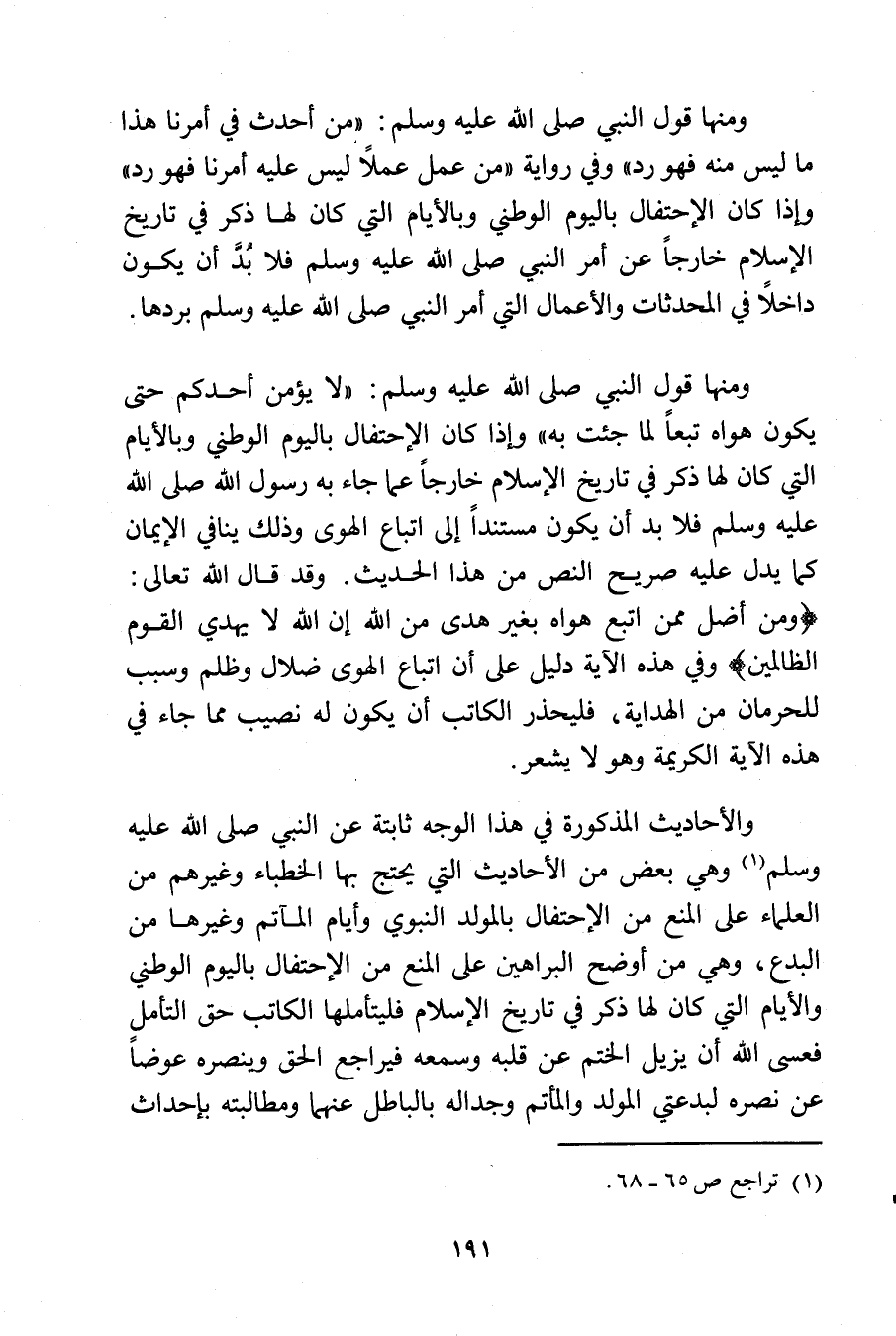 ومنها قول النبي - صلى الله عليه وسلم -: «لا يؤمن أحدكم حتى يكون هواه تبعاً لما جئت به» وإذا كان الاحتفال باليوم الوطني وبالأيام التي كان لها ذكر في تاريخ الإسلام خارجاً عما جاء به رسول الله - صلى الله عليه وسلم - فلا بد أن يكون مستنداً إلى اتباع الهوى وذلك ينافي الإيمان كما يدل عليه صريح النص من هذا الحديث. وقد قال الله تعالى: {ومن أضل ممن اتبع هواه بغير هدى من الله إن الله لا يهدي القوم الظالمين} وفي هذه الآية دليل على أن اتباع الهوى ضلال وظلم وسبب للحرمان من الهداية, فليحذر الكاتب أن يكون له نصيب مما جاء في هذه الآية الكريمة وهو لا يشعر.