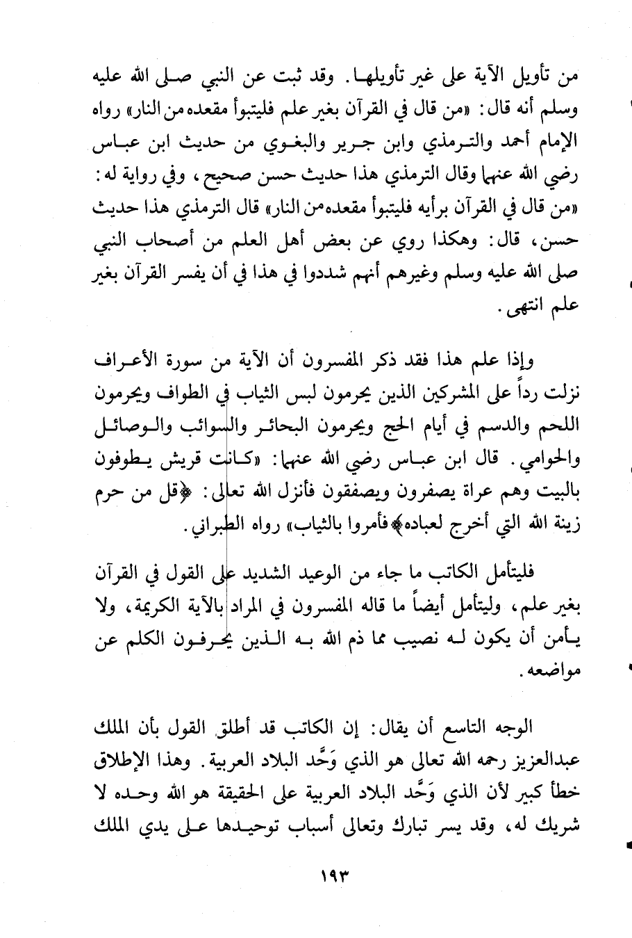 الوجه التاسع أن يقال: إن الكاتب قد أطلق القول بأن الملك عبد العزيز رحمه الله تعالى هو الذي وَحَّد البلاد العربية. وهذا الإطلاق خطأ كبير لأن الذي وَحَّد البلاد العربية على الحقيقة هو الله وحده لا شريك له, وقد يسر تبارك وتعالى أسباب توحيدها على يدي الملك