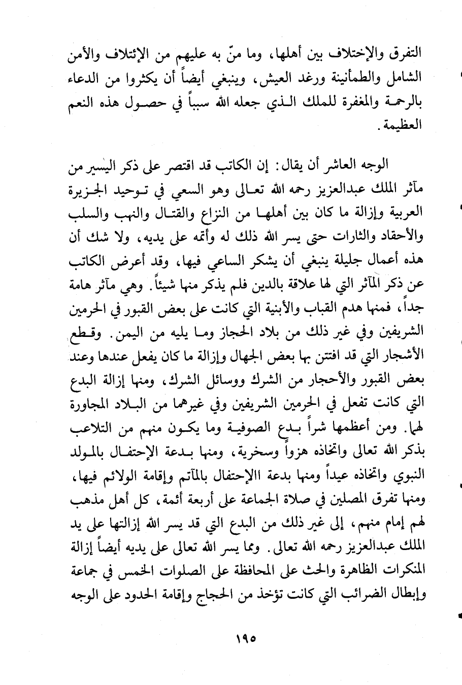 الوجه العاشر أن يقال: إن الكاتب قد اقتصر على ذكر اليسير من مآثر الملك عبد العزيز رحمه الله تعالى وهو السعي في توحيد الجزيرة العربية وإزالة ما كان بين أهلها من النزاع والقتال والنهب والسلب والأحقاد والثارات حتى يسر الله ذلك له وأتمه على يديه, ولا شك أن هذه أعمال جليلة ينبغي أن يشكر الساعي فيها, وقد أعرض الكاتب عن ذكر المآثر التي لها علاقة بالدين فلم يذكر منها شيئاً. وهي مآثر هامة جداً, فمنها هدم القباب والأبنية التي كانت على بعض القبور في الحرمين الشريفين وفي غير ذلك من بلاد الحجاز وما يليه من اليمن. وقطع الأشجار التي قد افتتن بها بعض الجهال وإزالة ما كان يفعل عندها وعند بعض القبور والأحجار من الشرك ووسائل الشرك, ومنها إزالة البدع التي كانت تفعل في الحرمين الشريفين وفي غيرهما من البلاد المجاورة لهما. ومن أعظمها شراً بدع الصوفية وما يكون منهم من التلاعب بذكر الله تعالى واتخاذه هزواً وسخرية, ومنها بدعة الاحتفال بالمولد النبوي واتخاذه عيداً ومنها بدعة الاحتفال بالمآتم وإقامة الولائم فيها, ومنها تفرق المصلين في صلاة الجماعة على أربعة أئمة, كل أهل مذهب لهم إمام منهم, إلى غير ذلك من البدع التي قد يسر الله إزالتها على يد الملك عبد العزيز رحمه الله تعالى. ومما يسر الله تعالى على يديه أيضاً إزالة المنكرات الظاهرة والحث على المحافظة على الصلوات الخمس في جماعة وإبطال الضرائب التي كانت تؤخذ من الحجاج وإقامة الحدود على الوجه