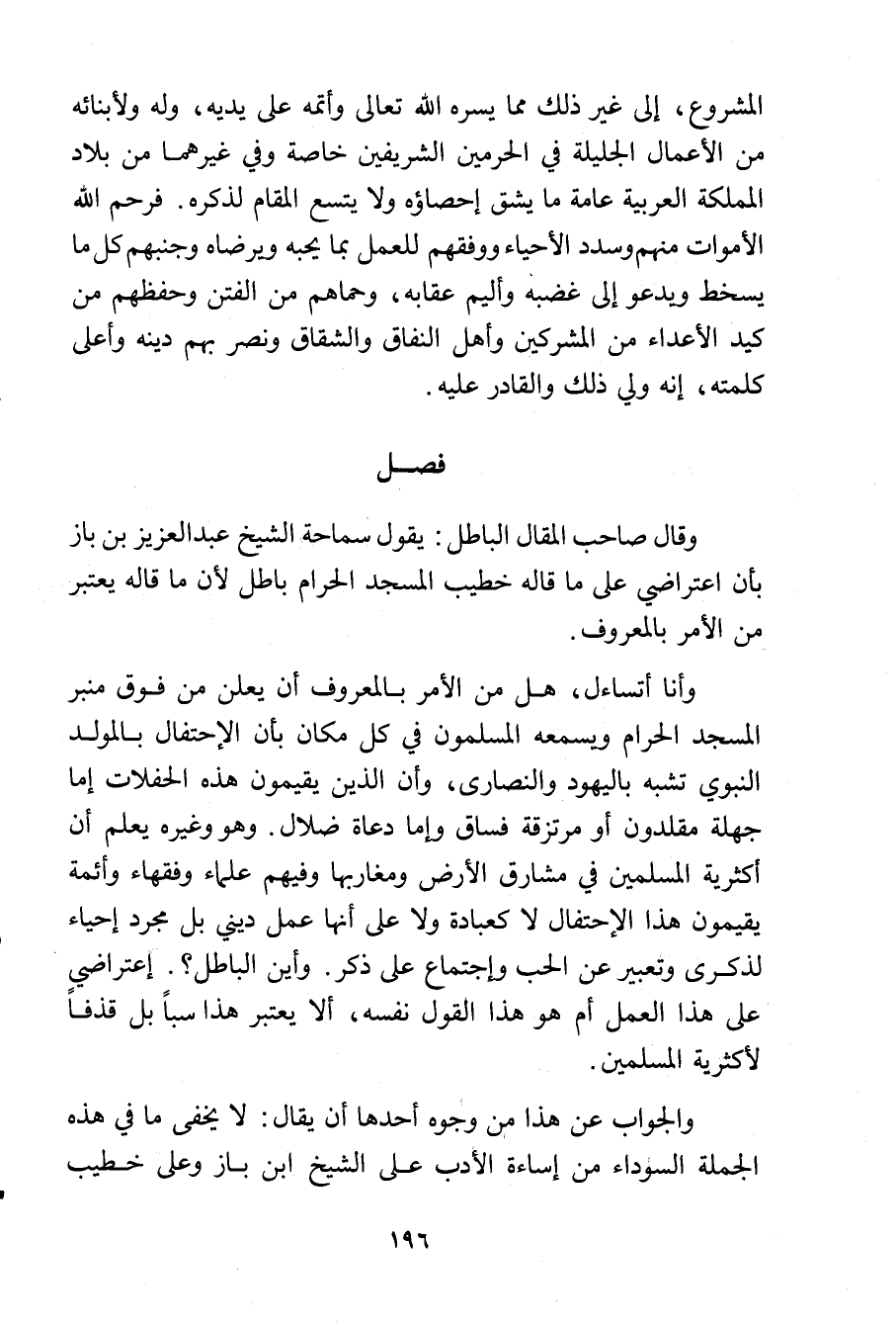 وأنا أتساءل, هل من الأمر بالمعروف أن يعلن من فوق منبر المسجد الحرام ويسمعه المسلمون في كل مكان بأن الاحتفال بالمولد النبوي تشبه باليهود والنصارى, وأن الذين يقيمون هذه الحفلات إما جهلة مقلدون أو مرتزقة فساق وإما دعاة ضلال. وهو وغيره يعلم أن أكثرية المسلمين في مشارق الأرض ومغاربها وفيهم علماء وفقهاء وأئمة يقيمون هذا الاحتفال لا كعبادة ولا على أنها عمل ديني بل مجرد إحياء لذكرى وتعبير عن الحب واجتماع على ذكر. وأين الباطل؟. اعتراضي على هذا العمل أم هو هذا القول نفسه, ألا يعتبر هذا سباً بل قذفاً لأكثرية المسلمين.