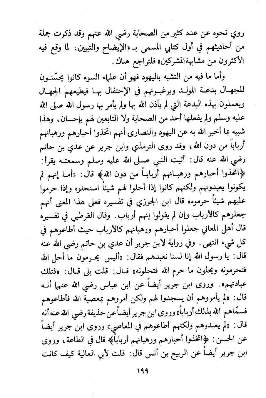 وأما ما فيه من التشبه باليهود فهو أن علماء السوء كانوا يحسّنون للجهال بدعة المولد ويرغبونهم في الاحتفال بها فيطيعهم الجهال ويعملون بهذه البدعة التي لم يأذن الله بها ولم يأمر بها رسول الله - صلى الله عليه وسلم - ولم يفعلها أحد من الصحابة ولا التابعين لهم بإحسان, وهذا شبيه بما أخبر الله به عن اليهود والنصارى أنهم اتخذوا أحبارهم ورهبانهم أرباباً من دون الله, وقد روى الترمذي وابن جرير عن عدي بن حاتم رضي الله عنه قال: أتيت النبي - صلى الله عليه وسلم - وسمعته يقرأ: {اتخذوا أحبارهم ورهبانهم أرباباً من دون الله} قال: «أما إنهم لم يكونوا يعبدونهم ولكنهم كانوا إذا أحلوا لهم شيئاً استحلوه وإذا حرموا عليهم شيئاً حرموه» قال ابن الجوزي في تفسيره فعلى هذا المعنى أنهم جعلوهم كالأرباب وإن لم يقولوا إنهم أرباب. وقال القرطبي في تفسيره قال أهل المعاني جعلوا أحبارهم ورهبانهم كالأرباب حيث أطاعوهم في كل شيء انتهى. وفي رواية لابن جرير أن عدي بن حاتم رضي الله عنه قال: يا رسول الله إنا لسنا نعبدهم فقال: «أليس يحرمون ما أحل الله فتحرمونه ويحلون ما حرم الله فتحلونه» قال: قلت بلى قال: «فتلك عبادتهم». وروى ابن جرير أيضاً عن ابن عباس رضي الله عنهما أنه قال: «لم يأمروهم أن يسجدوا لهم ولكن أمروهم بمعصية الله فأطاعوهم فسمّاهم الله بذلك أرباباً» وروى ابن جرير أيضاً عن حذيفة رضي الله عنه أنه قال: «لم يعبدوهم ولكنهم أطاعوهم في المعاصي» وروى ابن جرير أيضاً عن الحسن: {اتخذوا أحبارهم ورهبانهم أرباباً} قال في الطاعة, وروى ابن جرير أيضاً عن الربيع بن أنس قال: قلت لأبي العالية كيف كانت