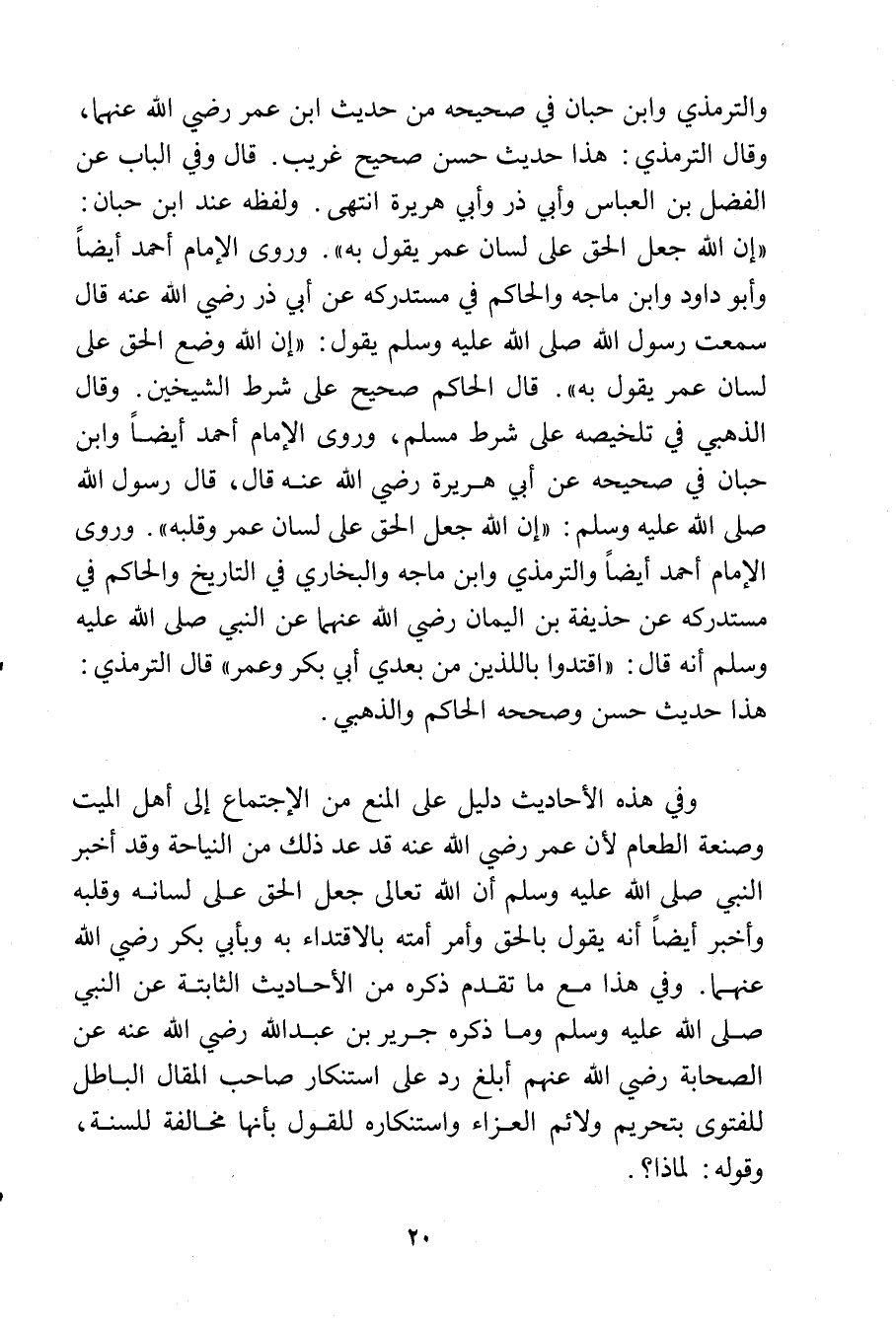 وفي هذه الأحاديث دليل على المنع من الاجتماع إلى أهل الميت وصنعة الطعام لأن عمر رضي الله عنه قد عد ذلك من النياحة وقد أخبر النبي - صلى الله عليه وسلم - أن الله تعالى جعل الحق على لسانه وقلبه وأخبر أيضاً أنه يقول بالحق وأمر أمته بالاقتداء به وبأبي بكر رضي الله عنهما. وفي هذا مع ما تقدم ذكره من الأحاديث الثابتة عن النبي - صلى الله عليه وسلم - وما ذكره جرير بن عبد الله رضي الله عنه عن الصحابة رضي الله عنهم أبلغ رد على استنكار صاحب المقال الباطل للفتوى بتحريم ولائم العزاء واستنكاره للقول بأنها مخالفة للسنة, وقوله: لماذا؟.