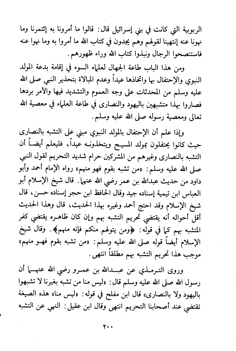 وإذا علم أن الاحتفال بالمولد النبوي مبني على التشبه بالنصارى حيث كانوا يحتفلون بمولد المسيح ويتخذونه عيداً, فليعلم أيضاً أن التشبه بالنصارى وغيرهم من المشركين حرام شديد التحريم لقول النبي - صلى الله عليه وسلم -: «من تشبه بقوم فهو منهم» رواه الإمام أحمد وأبو داود من حديث عبد الله بن عمر رضي الله عنهما. قال شيخ الإسلام أبو العباس ابن تيمية إسناده جيد وقال الحافظ ابن حجر إسناده حسن, قال شيخ الإسلام وقد احتج أحمد وغيره بهذا الحديث, قال وهذا الحديث أقل أحواله أنه يقتضي تحريم التشبه بهم وإن كان ظاهره يقتضي كفر المتشبه بهم كما في قوله: {ومن يتولهم منكم فإنه منهم}. وقال شيخ الإسلام أيضاً قوله - صلى الله عليه وسلم -: «من تشبه بقوم فهو منهم» موجب هذا تحريم التشبه بهم مطلقاً انتهى.