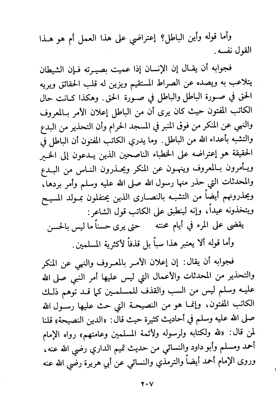 فجوابه أن يقال: إن إعلان الأمر بالمعروف والنهي عن المنكر والتحذير من المحدثات والأعمال التي ليس عليها أمر النبي - صلى الله عليه وسلم - ليس من السب والقذف للمسلمين كما قد توهم ذلك الكاتب المفتون, وإنما هو من النصيحة التي حث عليها رسول الله - صلى الله عليه وسلم - في أحاديث كثيرة حيث قال: «الدين النصيحة» قلنا لمن قال: «لله ولكتابه ولرسوله ولأئمة المسلمين وعامتهم» رواه الإمام أحمد ومسلم وأبو داود والنسائي من حديث تميم الداري رضي الله عنه, وروى الإمام أحمد أيضاً والترمذي والنسائي عن أبي هريرة رضي الله عنه