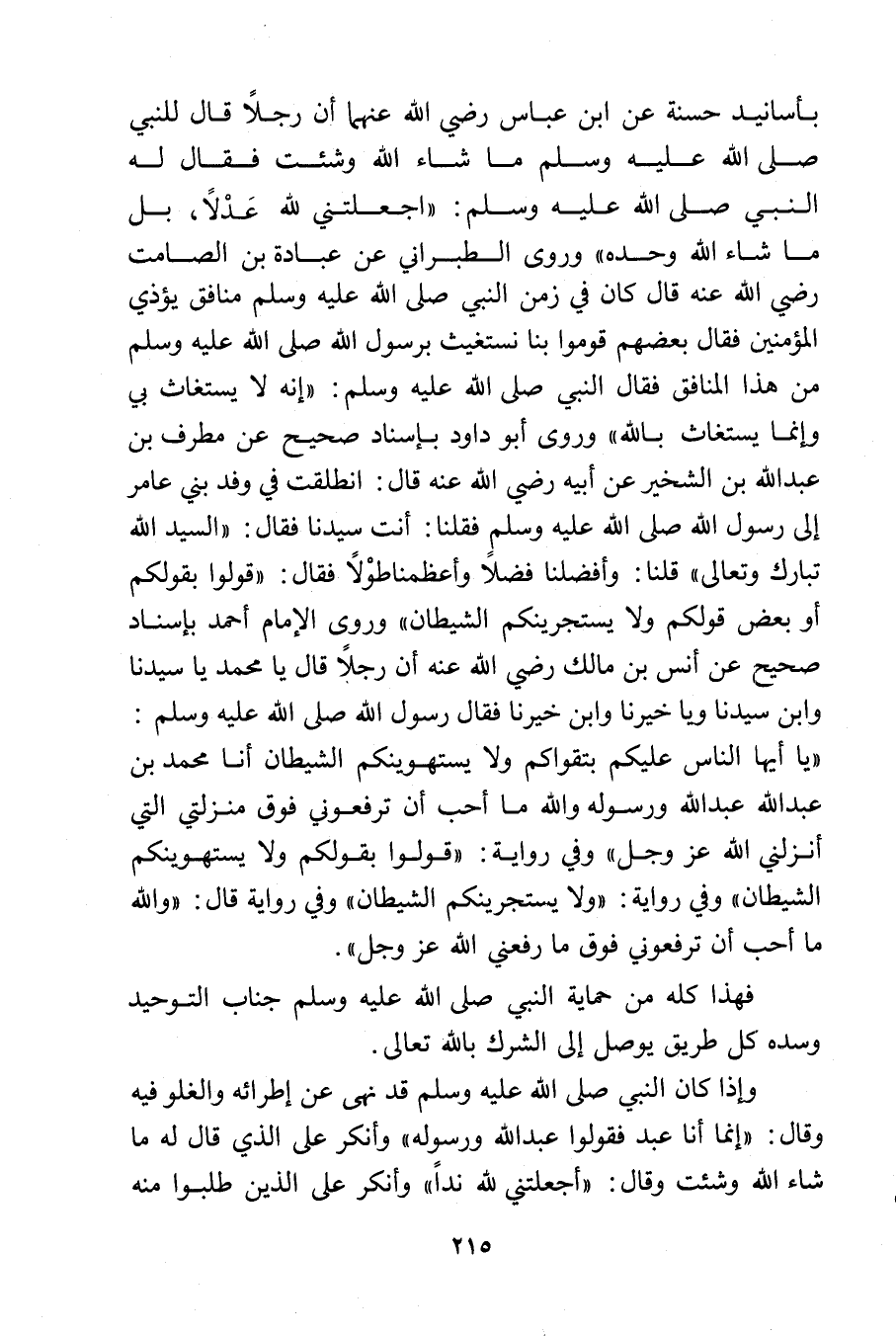 بأسانيد حسنة عن ابن عباس رضي الله عنهما أن رجلاً قال للنبي - صلى الله عليه وسلم - ما شاء الله وشئت فقال له النبي - صلى الله عليه وسلم -: «أجعلتني لله عَدْلاً, بل ما شاء الله وحده» وروى الطبراني عن عبادة بن الصامت رضي الله عنه قال كان في زمن النبي - صلى الله عليه وسلم - منافق يؤذي المؤمنين فقال بعضهم قوموا بنا نستغيث برسول الله - صلى الله عليه وسلم - من هذا المنافق فقال النبي - صلى الله عليه وسلم -: «إنه لا يستغاث بي وإنما يستغاث بالله» وروى أبو داود بإسناد صحيح عن مطرف بن عبد الله بن الشخير عن أبيه رضي الله عنه قال: انطلقت في وفد بني عامر إلى رسول الله - صلى الله عليه وسلم - فقلنا: أنت سيدنا فقال: «السيد الله تبارك وتعالى» قلنا: وأفضلنا فضلاً وأعظمنا طوْلاً فقال: «قولوا بقولكم أو بعض قولكم ولا يستجرينكم الشيطان» وروى الإمام أحمد بإسناد صحيح عن أنس بن مالك رضي الله عنه أن رجلاً قال يا محمد يا سيدنا وابن سيدنا ويا خيرنا وابن خيرنا فقال رسول الله - صلى الله عليه وسلم -: «يا أيها الناس عليكم بتقواكم ولا يستهوينكم الشيطان أنا محمد بن عبد الله عبد الله ورسوله والله ما أحب أن ترفعوني فوق منزلتي التي أنزلني الله عز وجل» وفي رواية: «قولوا بقولكم ولا يستهوينكم الشيطان» وفي رواية: «ولا يستجرينكم الشيطان» وفي رواية قال: «والله ما أحب أن ترفعوني فوق ما رفعني الله عز وجل».