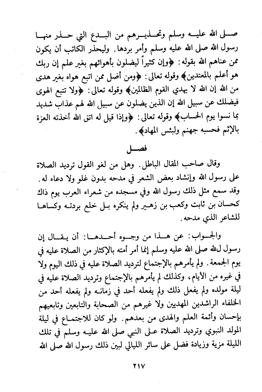 والجواب: عن هذا من وجوه أحدها: أن يقال إن رسول الله - صلى الله عليه وسلم - إنما أمر أمته بالإكثار من الصلاة عليه في يوم الجمعة. ولم يأمرهم بالاجتماع لترديد الصلاة عليه في ذلك اليوم ولا في غيره من الأيام, وكذلك لم يأمرهم بالاجتماع وترديد الصلاة عليه في ليلة مولده ولم يفعل ذلك ولم يفعله أحد في زمانه ولم يفعله أحد من الخلفاء الراشدين المهديين ولا غيرهم من الصحابة والتابعين وتابعيهم بإحسان وأئمة العلم والهدى من بعدهم. ولو كان للاجتماع في ليلة المولد النبوي وترديد الصلاة على النبي - صلى الله عليه وسلم - في تلك الليلة مزية وزيادة فضل على سائر الليالي لبين ذلك رسول الله - صلى الله